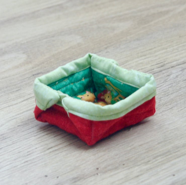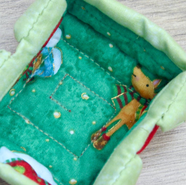 They are made using a mixture of Snowman and Reindeer on a forest green background and Christmas Red coloured cotton fabric and are quilted with a polyester/cotton blend wadding to give the box some shape. The edges are then bound using a binding made with with a light green cotton fabric. Finally the corners are folded up and hand sewn to the edge to give stability to the box.