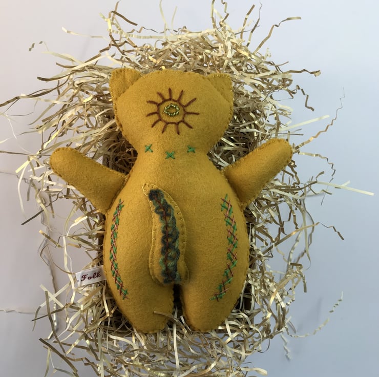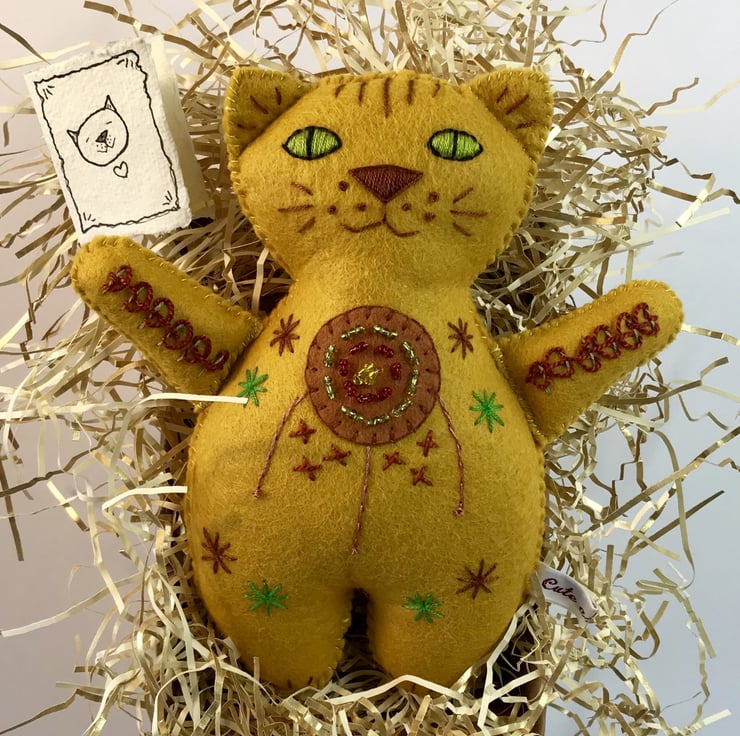 This gorgeous Dandycat is named Mr Mustard and he is entirely handmade from wool blend felt in a lovely (you guessed it!) mustard shade. He is hand embroidered both back and front and measures approximately 19cm or 7.5 inches high.