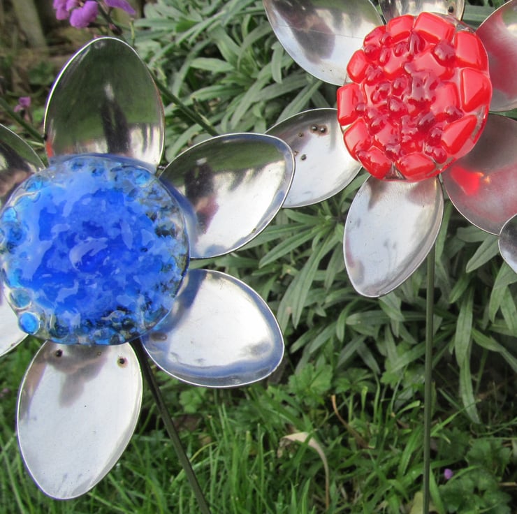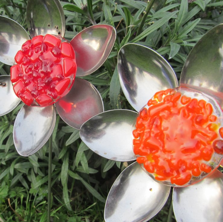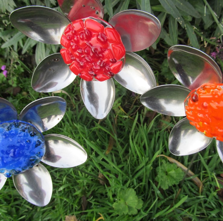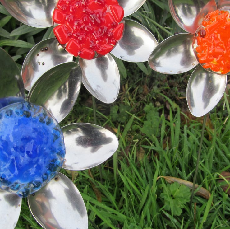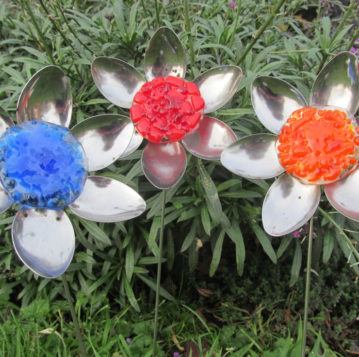 Each flower has been made using tea spoons for the petals and we have finished each one with a brightly coloured fused glass centre, this set consists of 1 red, 1 orange and 1 blue centred flower.