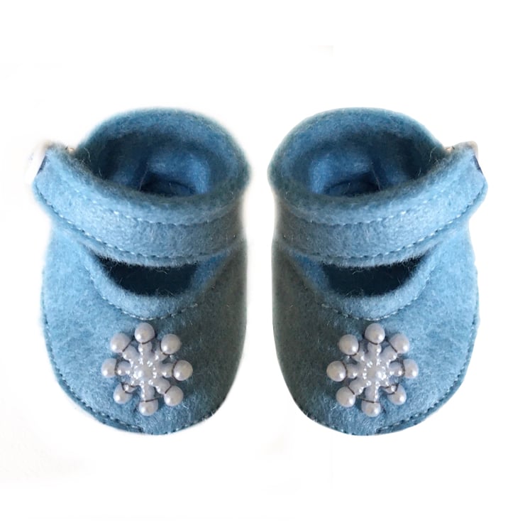 A cute little pair of pale blue felt shoes, to fit the Mulberry Green characters. The shoe are decorated with little pearl snowflakes and fasten with a popper underneath a little white button.