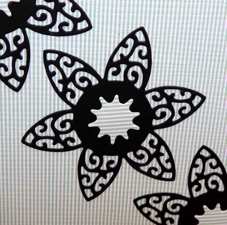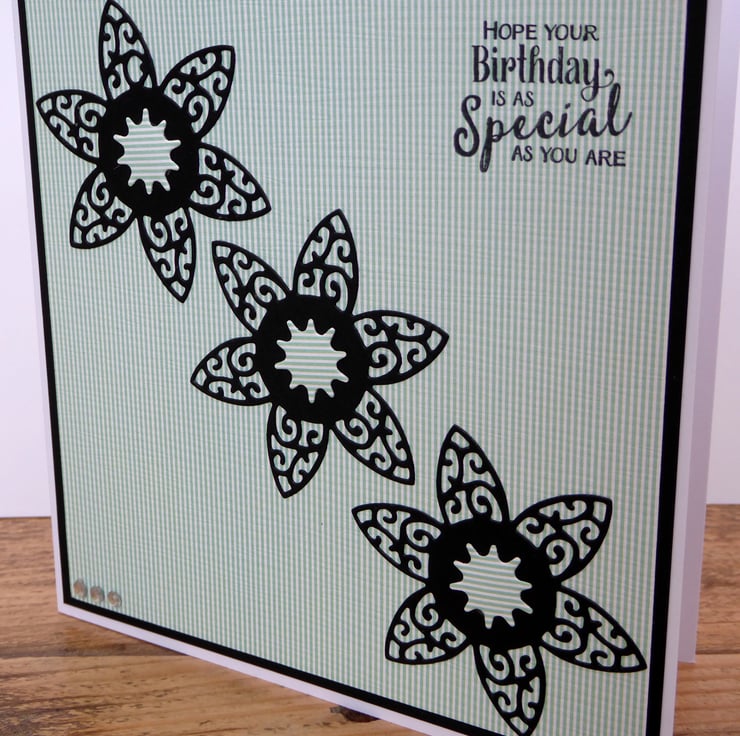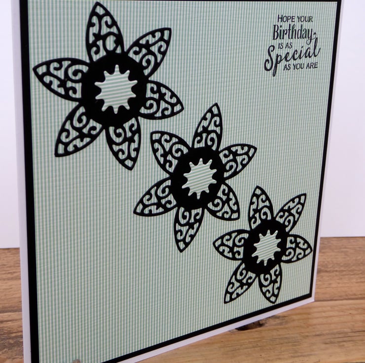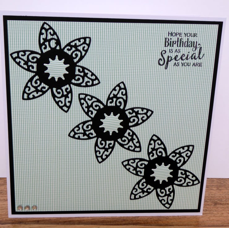 Made from 300 gsm white card. Used black and patterned card, die-cut flowers and stamped a sentiment. Added gems to complete.