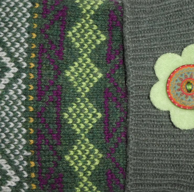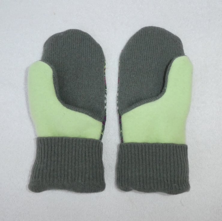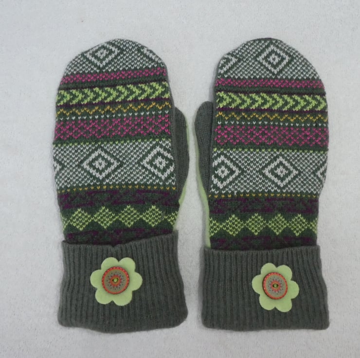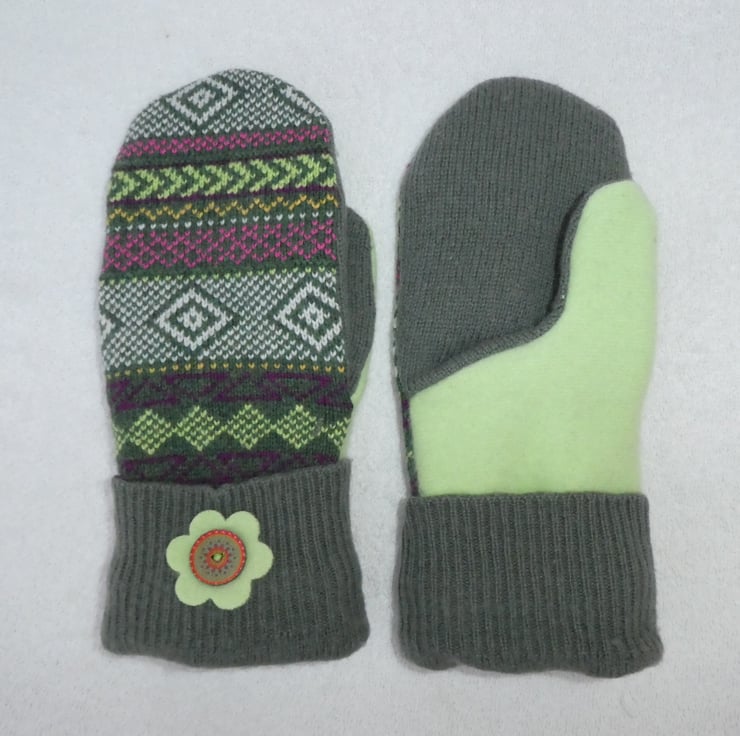 These warm and cosy winter mittens have been re-fashioned from up-cycled wool sweaters. The jumpers have been washed and felted before stitching. A full lining for the mittens has been made from polyester polar fleece for warmth and comfort. A decorative felt flower with button center has been stitched to the cuff of the mittens.