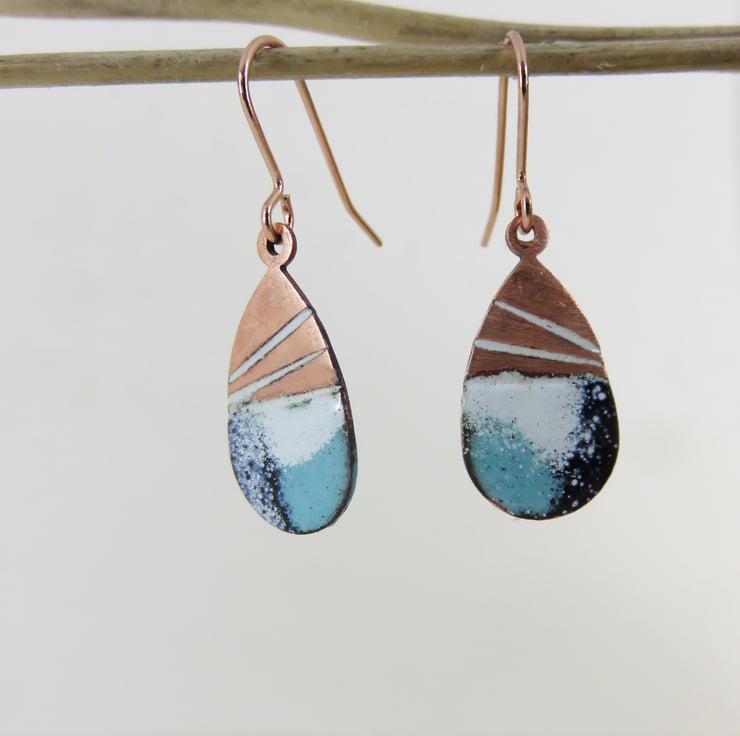 25mm x 12mm teardrop copper dangle earrings decorated with line texture and the bottoms covered in turquoise, white and black enamel. Hung on rose gold plated earring hooks for pierced ears. Fired in the kiln at 830 degrees.