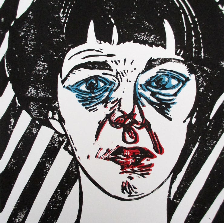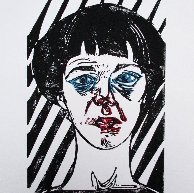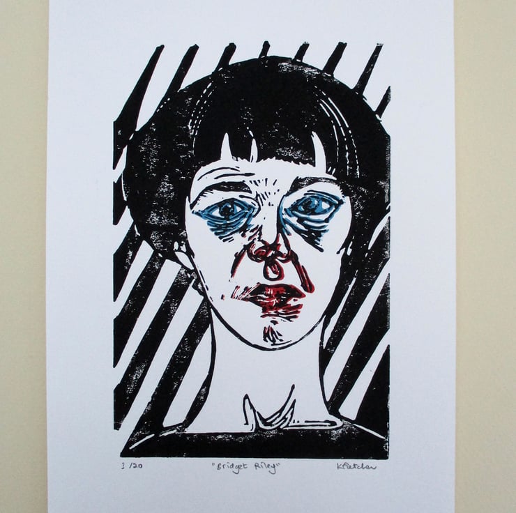 This is a hand pressed linocut print portrait of British artist Bridget Riley.