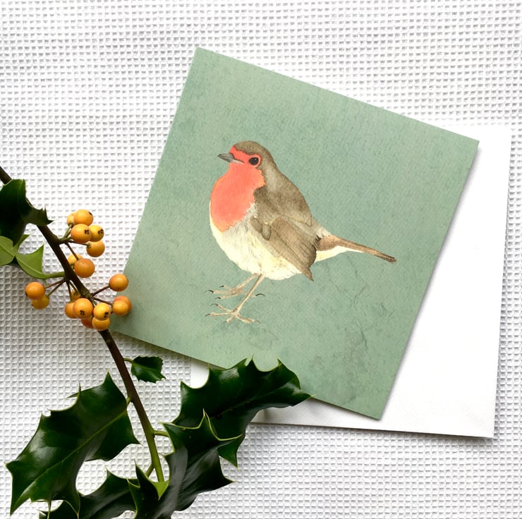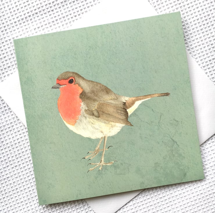 Featuring a watercolour robin on a green background, this square card makes a perfect notecard or greeting card for the gardeners and wildlife fans in your life.