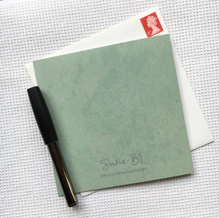 The card is 148 mm x 148 mm square, and is left blank inside with an easy-to-write on surface for your own message. A white laid envelope is provided. The card and envelope are packaged in a compostable clear bag, and posted to you in a sturdy, board back mailer.