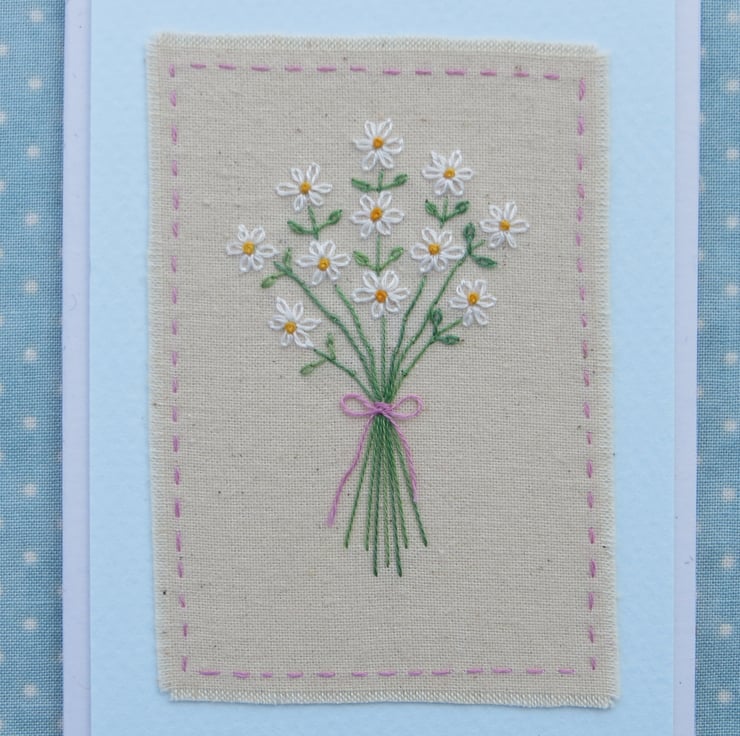 I love to sit with a needle and fine white silk thread and just stitch straight onto the cloth and see what emerges! These little daisies were made that way and when complete I tied a little thread bow around them. This greeting card could be a gift in itself to keep and frame, as well as a card in which to write your message.