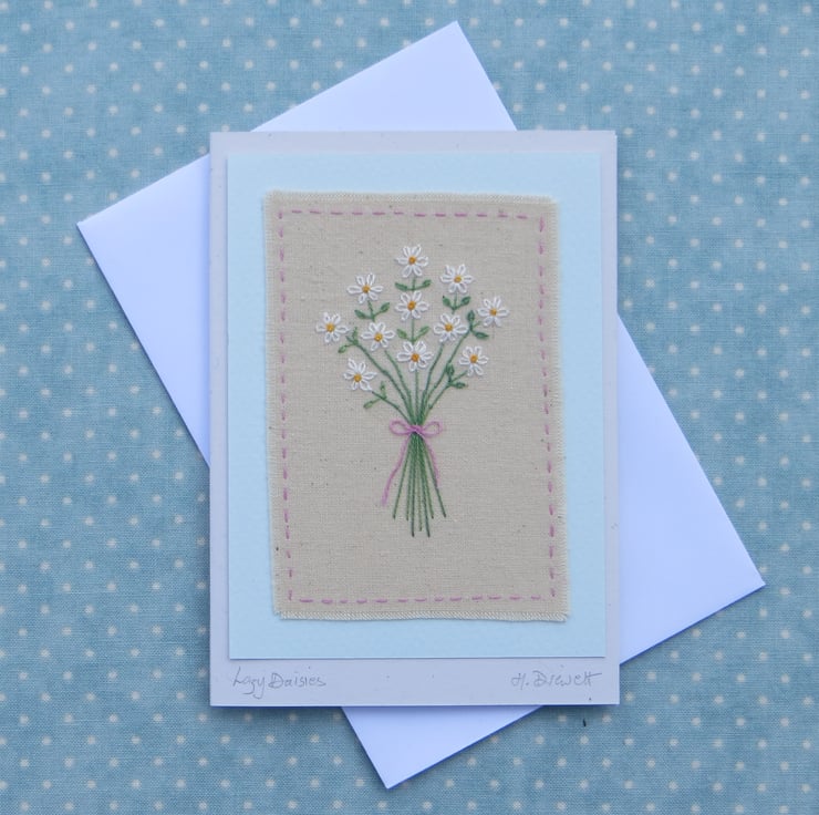 This is a small handmade greeting card featuring miniature hand-stitched daisies tied with a bow. The flowers are worked in an embroidery stitch called a Lazy Daisy, hence the title! It is definitely a card to keep, suitable for almost any occasion! (perfect to frame too!)