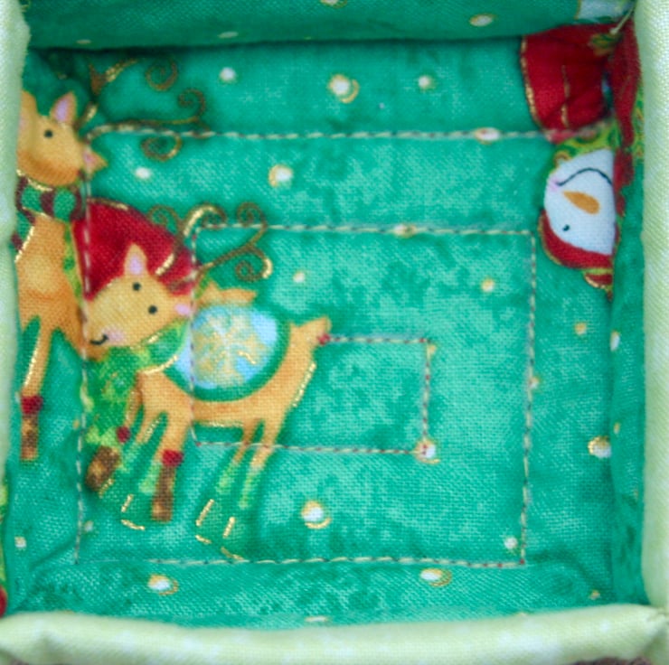 They are made using a mixture of Snowman and Reindeer on a forest green background and Christmas Red coloured cotton fabric and are quilted with a polyester/cotton blend wadding to give the box some shape. The edges are then bound using a binding made with with the light green cotton fabric. Finally the corners are pinched together and hand sewn to give definition to the corners of the box.