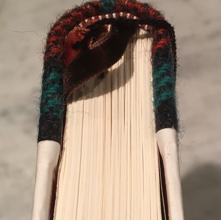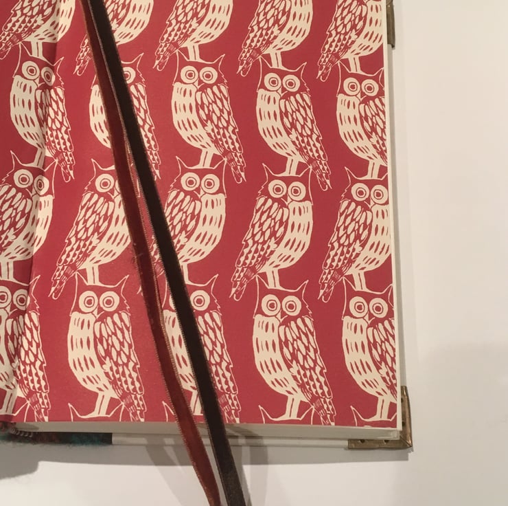 This one is called 'Brown Owl', bound with rust and green Harris Tweed, 240 pages of smooth ivory plain wood free and acid free paper (130gsm so suitable for fountain pen, sketching or drawing), stitched with waxed vintage Barbour linen thread, gorgeous owl design endpapers, twin dark brown and mid-brown velvet ribbon markers, brown and white endbands, and measures 220 x 165 x 30 mm.