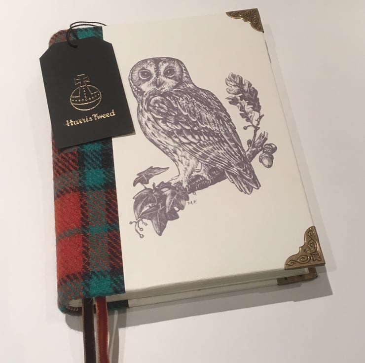 This is one of a series of A5 size journals, handmade by me at my home studio in the New Forest. All of them have a spine covered in genuine Harris Tweed, high quality either plain or printed endpapers, two velvet ribbon markers and decorative metal corners for extra protection.The front and back covers have either a stag or an owl design by illustrator Mandy Flockton. Each journal is supplied with a genuine Harris Tweed information label.
