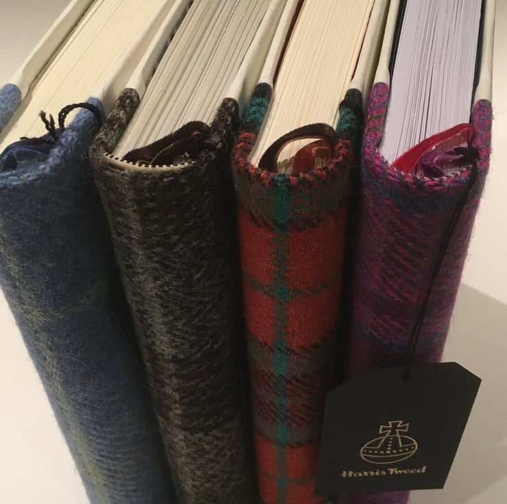 I have been binding notebooks and journals for some time and had an opportunity to progress onto making special books using luxury and high quality materials. These journals are lovely to create and I try and make each one a little bit different but all inspired by the Harris Tweed piece used to form the spine and finished with a variety of different endpapers from specialist printers or bookbinding suppliers. These are all hand stitched and bound by me at my home studio near the New Forest.