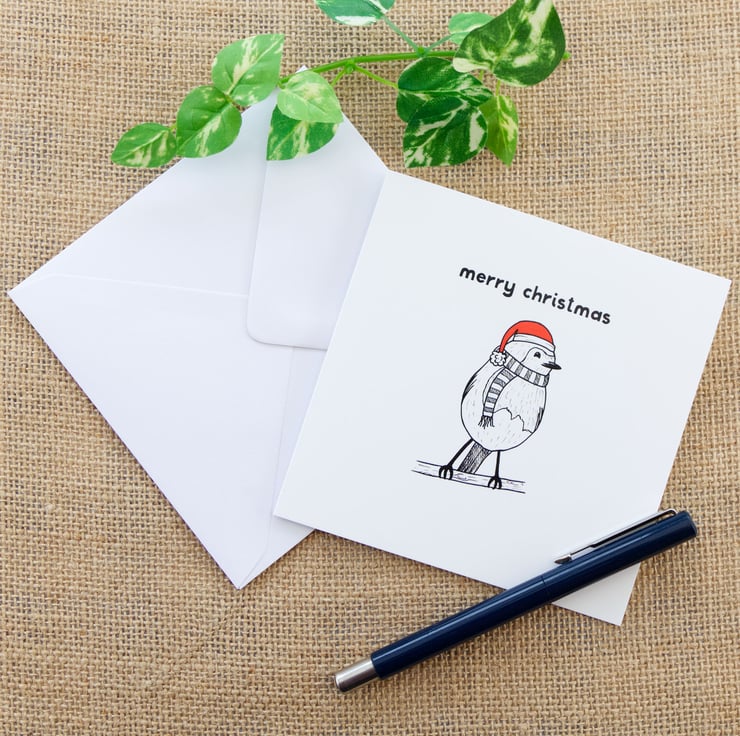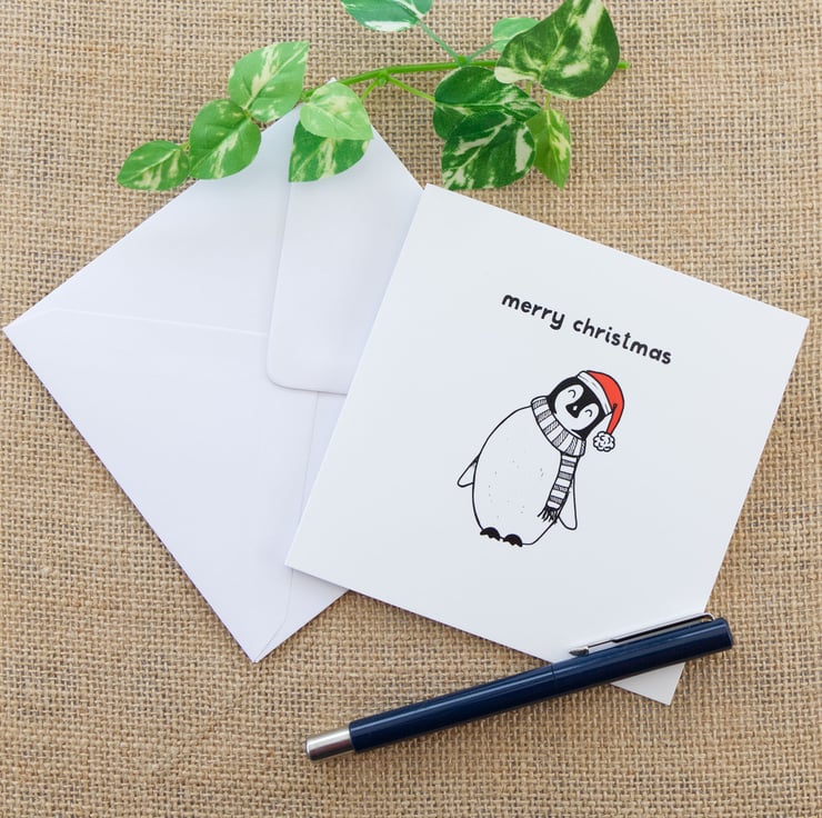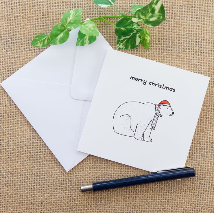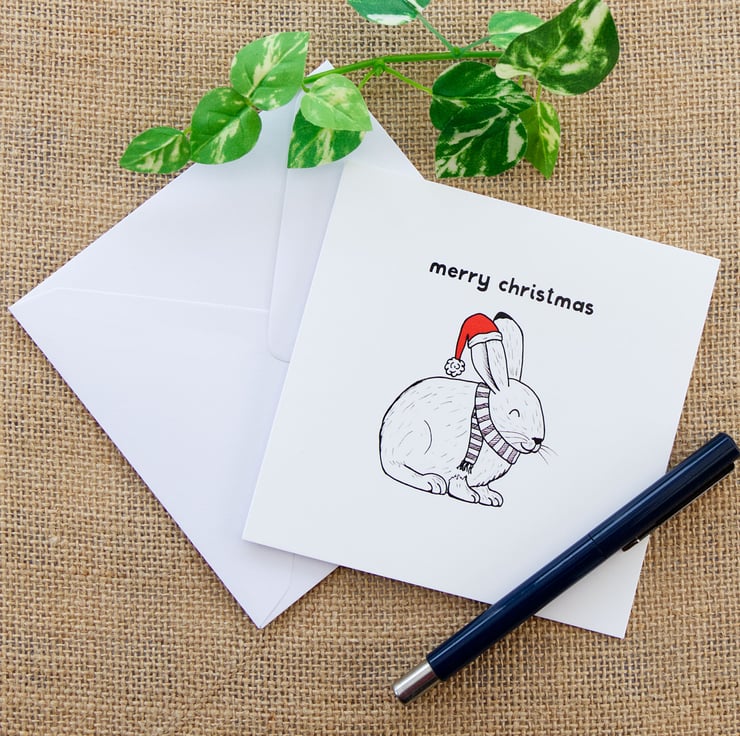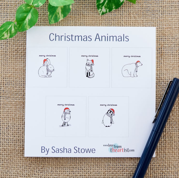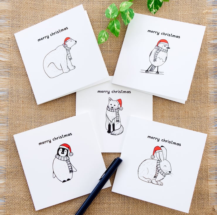 A pack of five Christmas cards with illustrations of cute animals with Santa hats on. The five different designs are a Christmas robin, fox, penguin, polar bear and snowshoe hare. Original illustrations were done with pen and ink with the hats coloured with a red marker pen.
