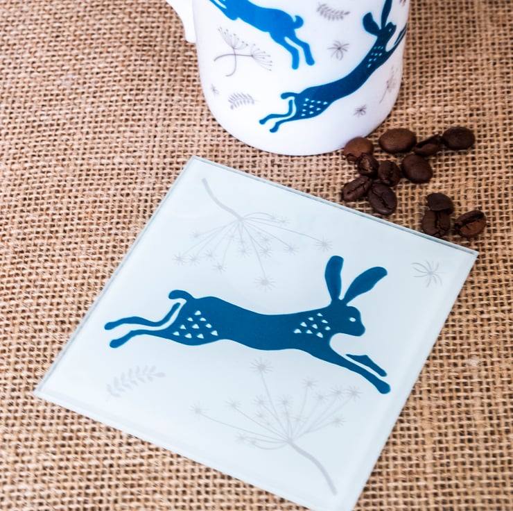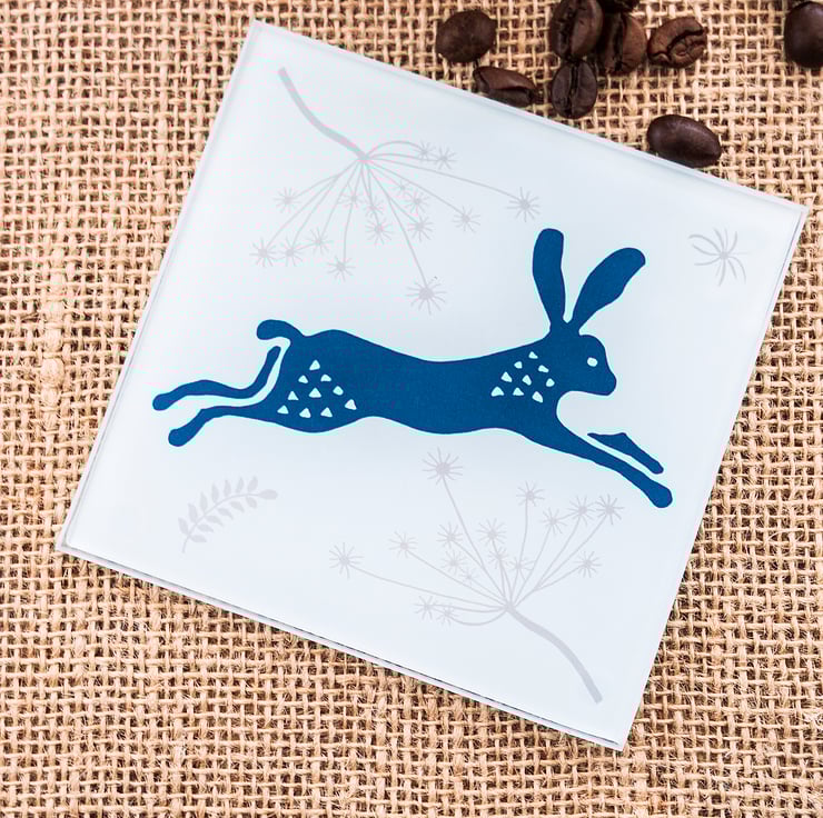 This lovely glass coaster shows a leaping hare in a turquoise/aqua colour. Surrounding it are pale grey hints of summer meadow flowers. A modern, graphic design that is bound to please any nature, countryside, hare or animal lover.