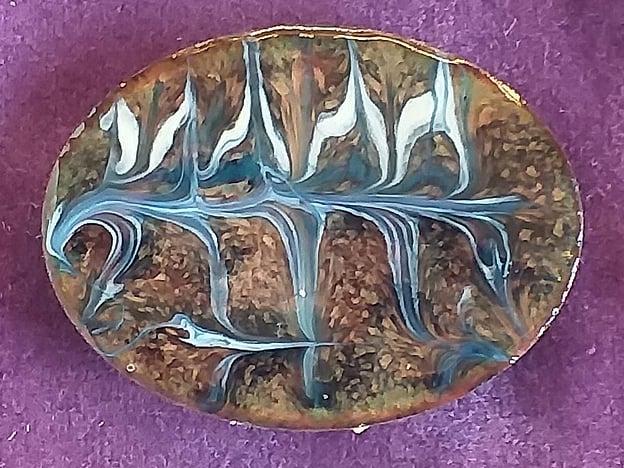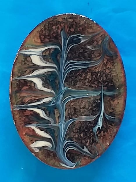 To make this brooch I first built up several layers of clear enamel then added a layer of black. The copper base may be seen behind the black, golden brown. I added rods of white and blue-grey enamel. which I then disturbed with a steel point while the brooch was at red hot in the kiln, creating the unique, random scrolled pattern.