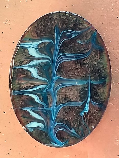 This brooch measures 40mm by 30mm. It is mounted on a 26mm brooch bar I have soldered to the copper base. The pin secures with a rotating catch. The brooch bar is mounted along the centre line of the oval and the brooch may therefore be worn vertical, as shown in most of the pictures, or horizontal.