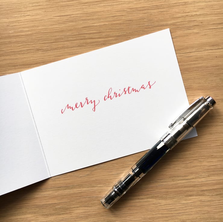 The hens were painted in watercolour, with details added in ink. Inside, the words 'merry christmas' are written in a contemporary calligraphy style using a traditional dip pen. The background is a soft white.