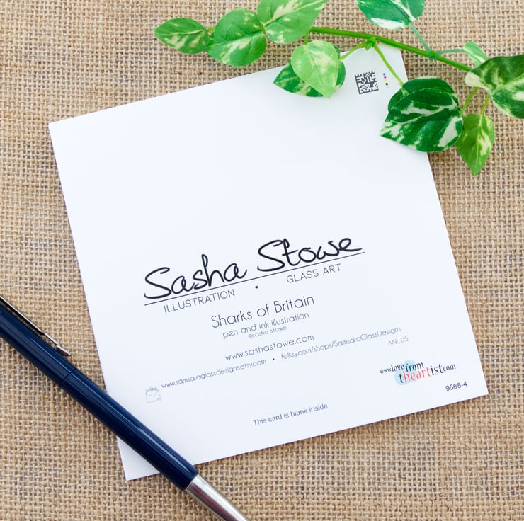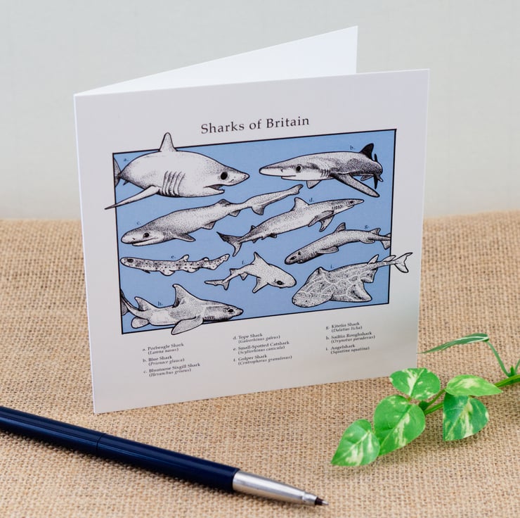 An informative card showing the common sharks in British and Atlantic waters. The original illustration was done using pen and ink and then coloured digitally. The card is blank inside so you can write your own message.