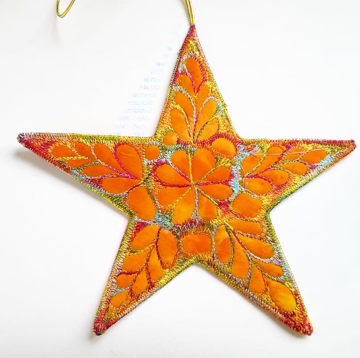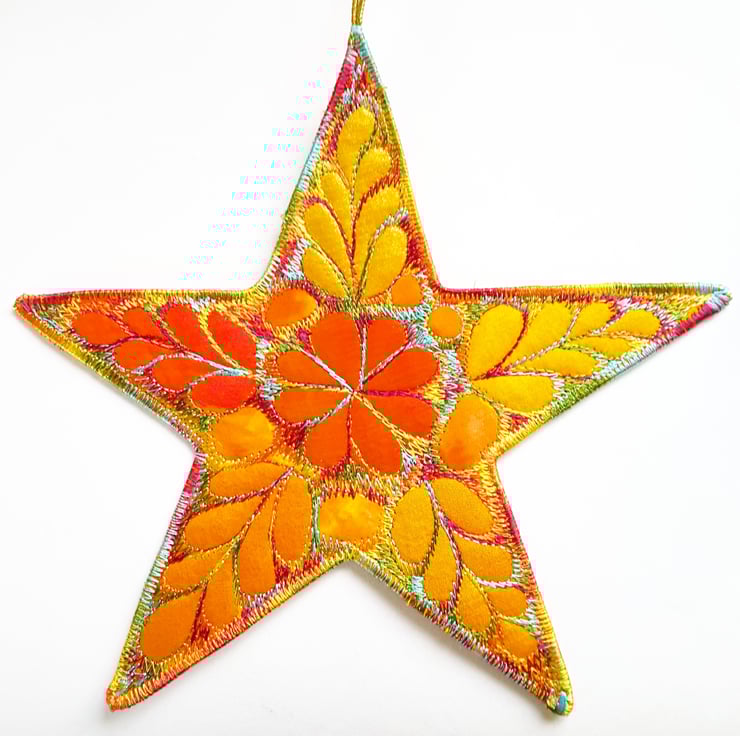 This is a handmade machine stitched fabric yellow star hanging decoration with a gold loop to hang it by.