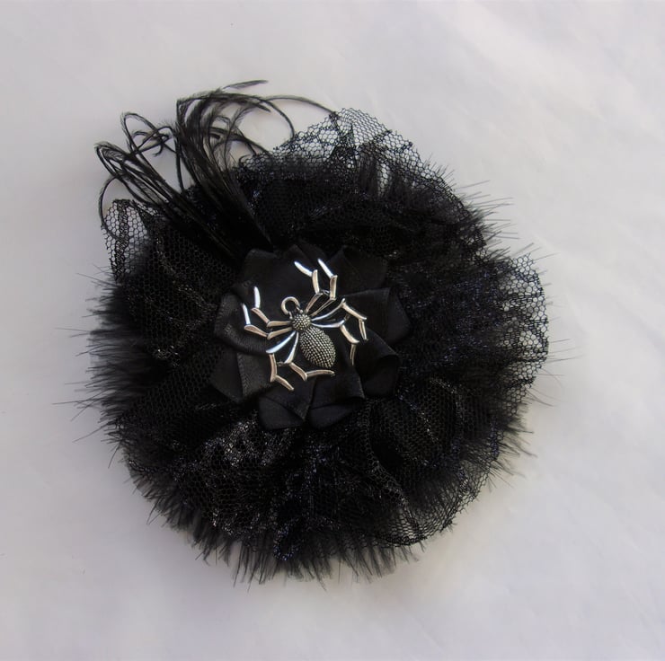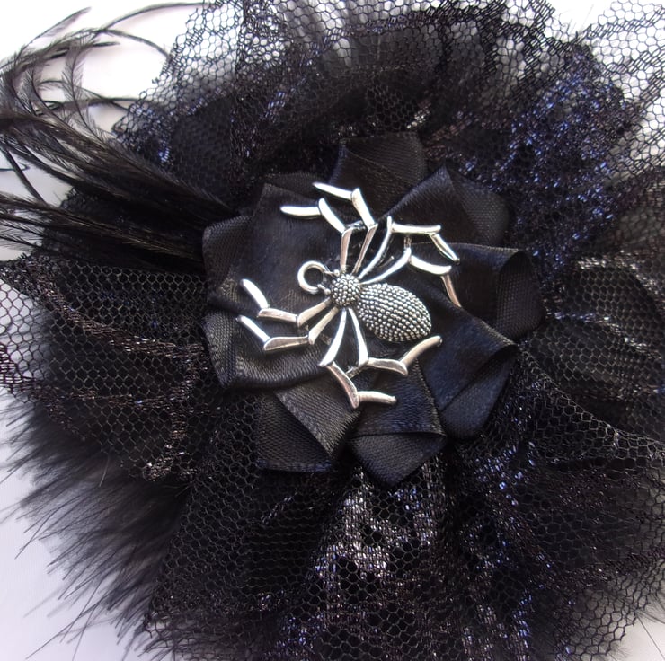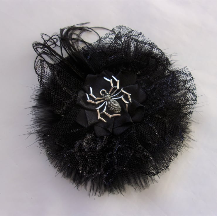 Black Feather Lace & Silver Spider Gothic Wedding Brooch