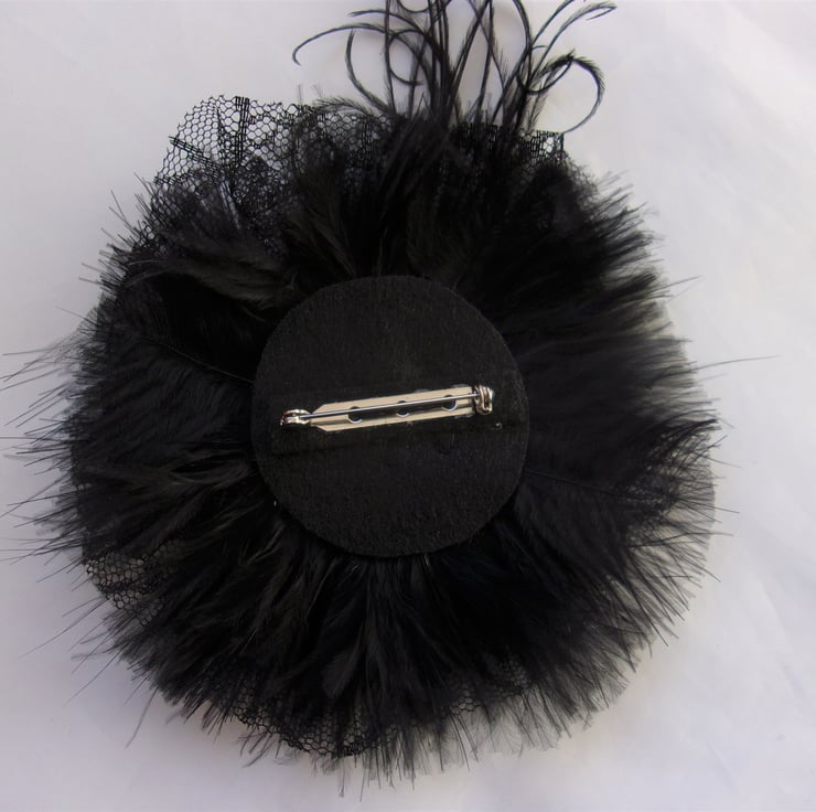 Created with trimmed black fluff feathers, gathered black cobweb tulle and ostrich curled fronds.