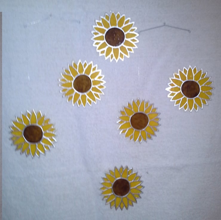 A touch of summer sunshine all year round! These sunflowers look as though they are made from stained glass, but they are light weight and safe to hang. They look great hung where light can shine through them, and their almost constant movement can throw moving patterns of yellow light on walls and floors.