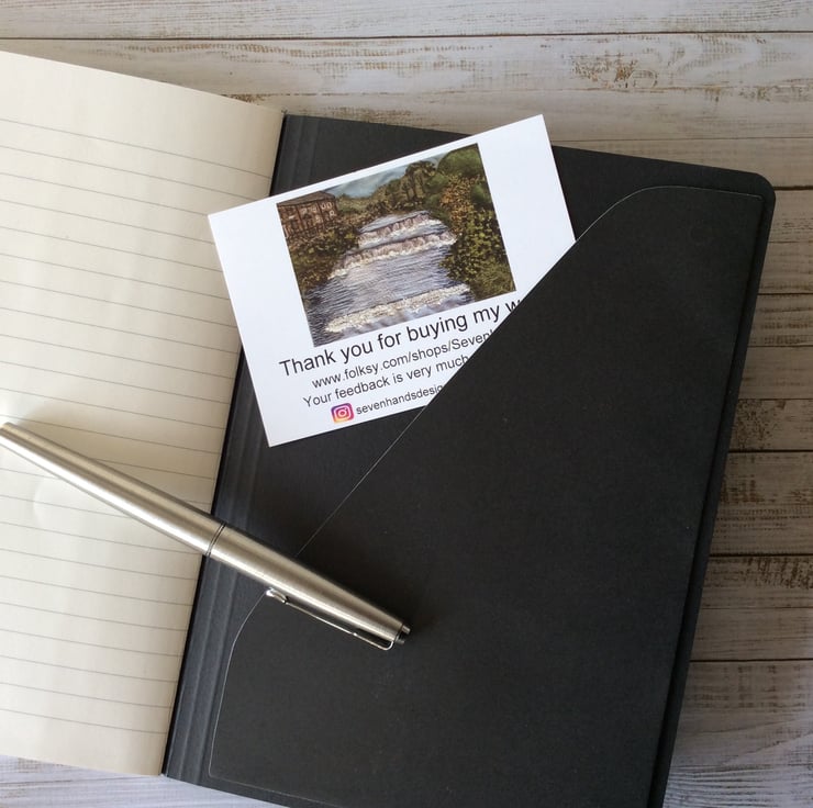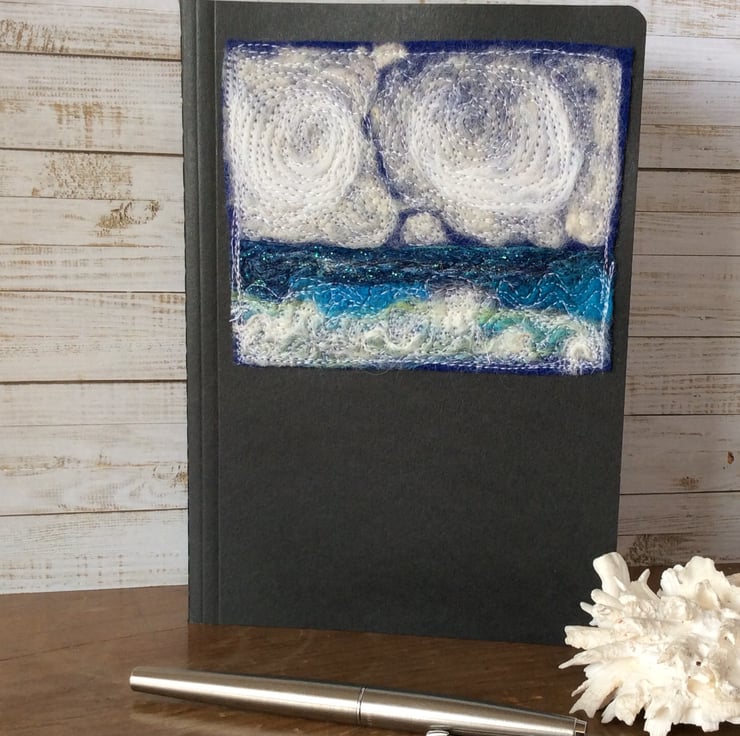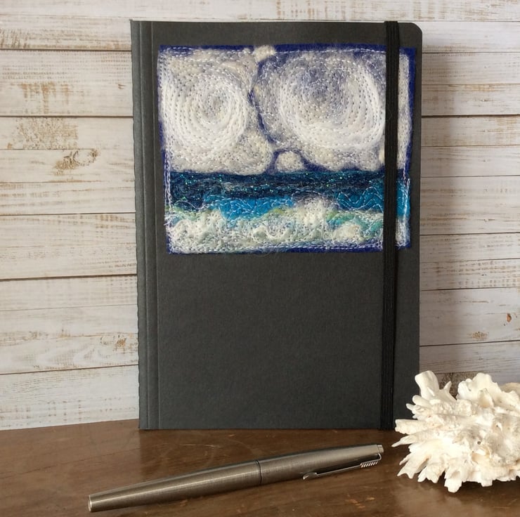 A5 Seascape Notebook with lined paper pages and an embroidered black card cover. It’s enhanced with an original felting wool free motion embroidery of the sea. It’s ideal for making notes, lists or doodling, and will neatly fit a handbag. The stitched A5 notebook is made from paper and black card, measures 15 x 21cm, contains 40 pages (80 sides), inside the back cover is a little pocket for important notes or cards and it has a strap to keep it tidy. The artwork measures 12.5 x 10 cm.
