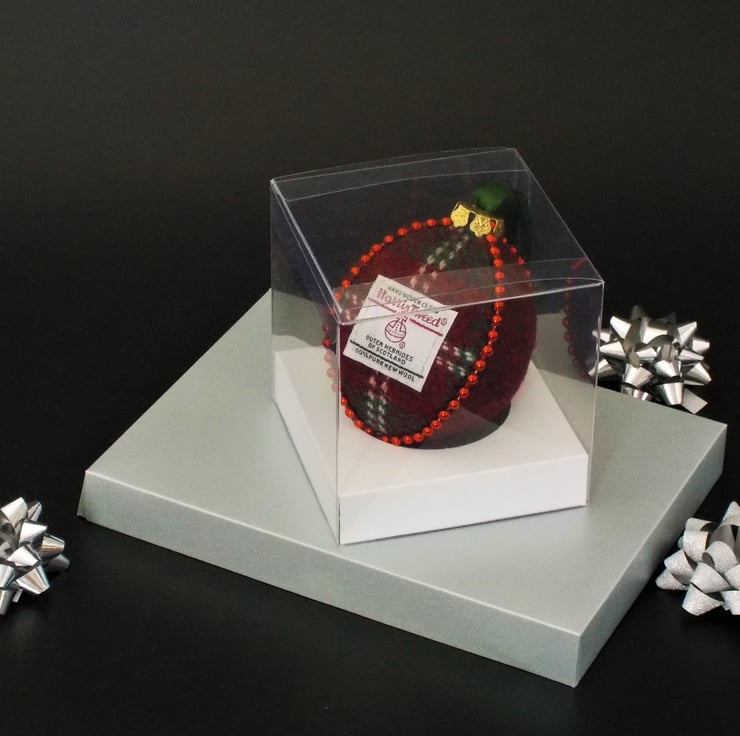 Luxury heirloom Christmas tree decoration handmade from Harris tweed hand-woven fabric in red tartan. It is approx. 7.5cm in diameter and comes complete with a green satin ribbon hanging loop. The "Orb" label, your guarantee of genuine Harris tweed is proudly displayed.
