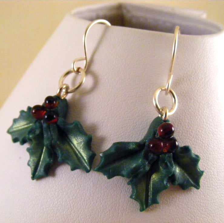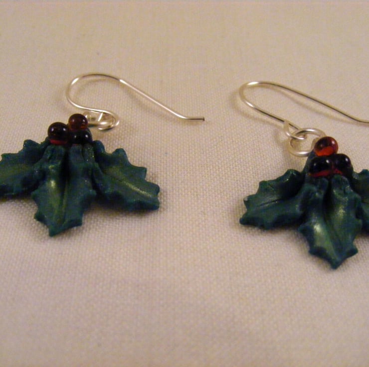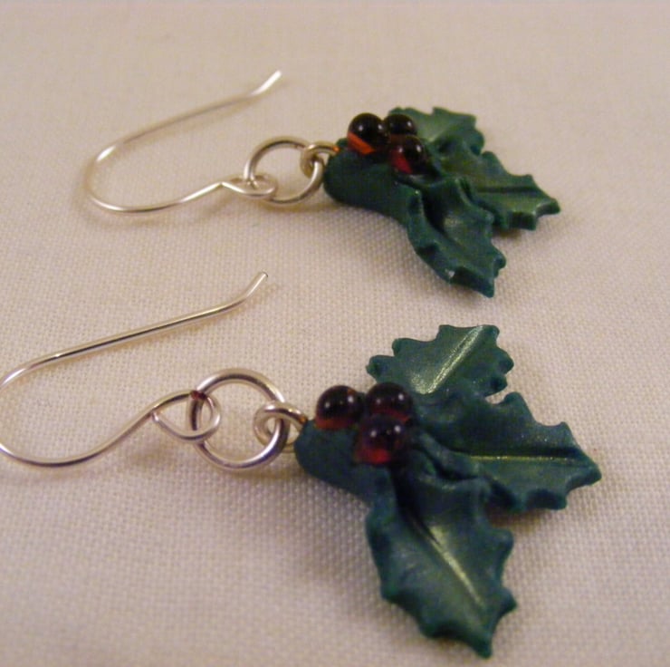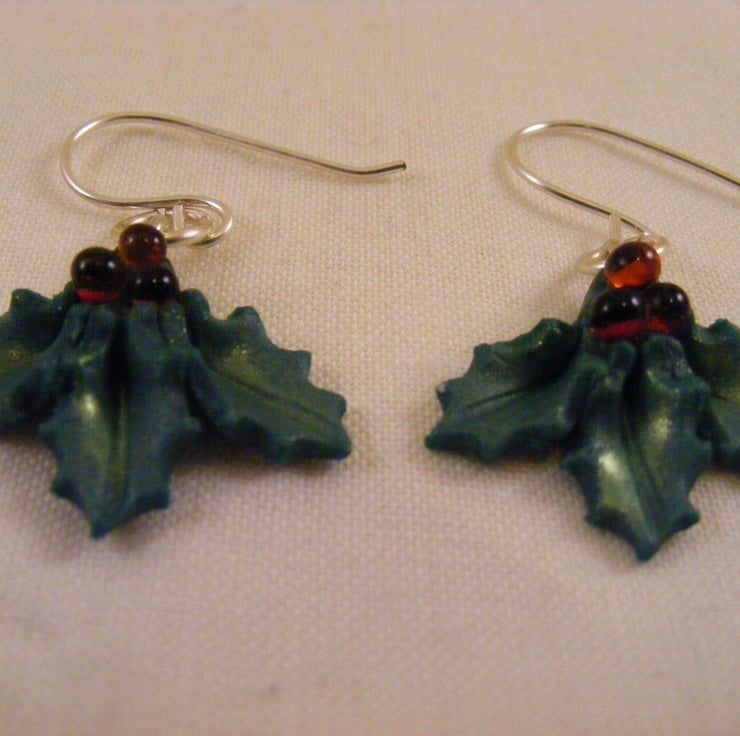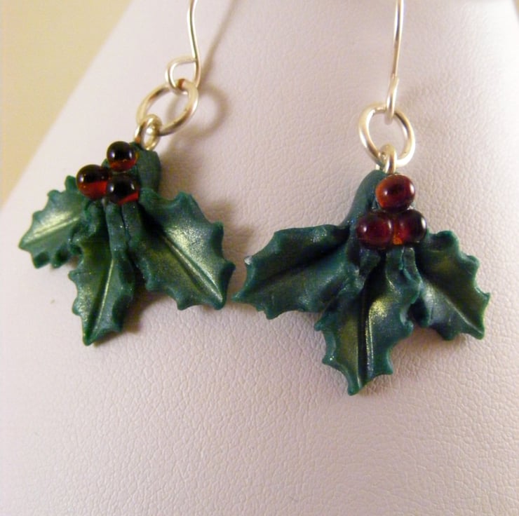 Holly earrings are handmade with, 27 x 20 mm polymer clay beads with have 3 mm red glass beads . Ear wires are handmade with silver plated copper, hypo allergenic, non tarnish wire.