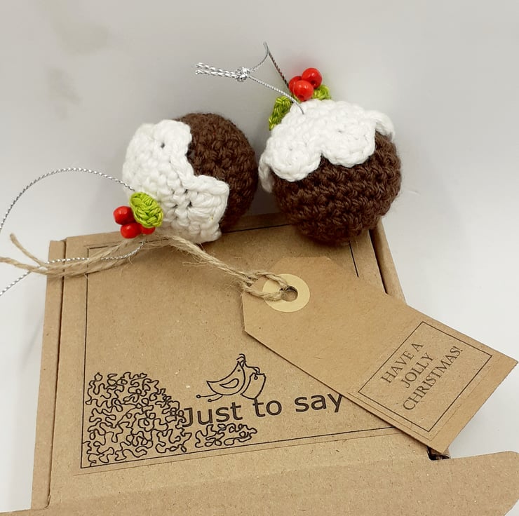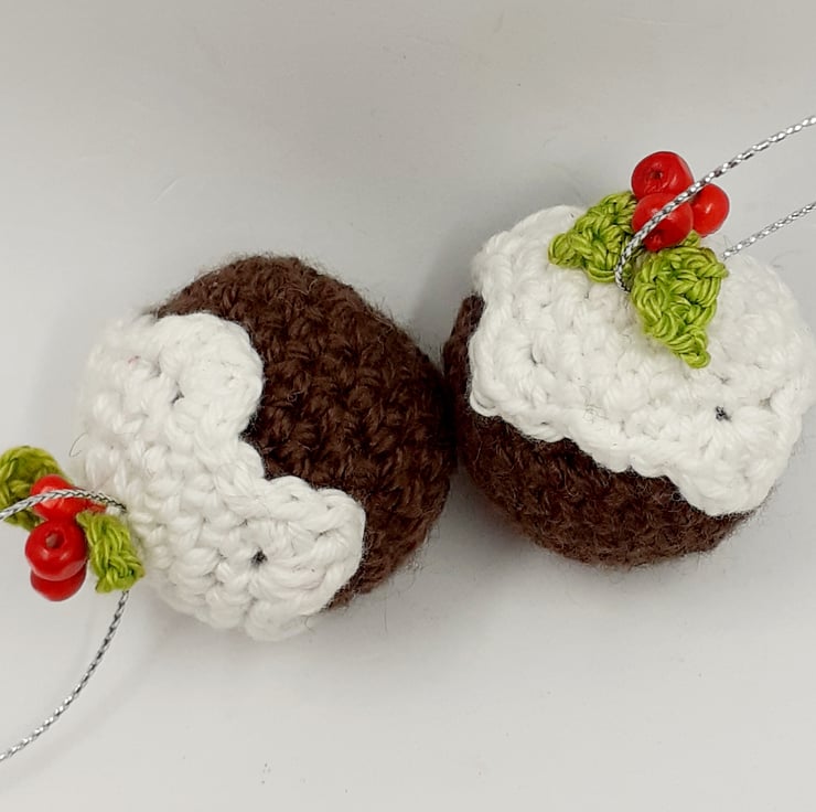 These two little puds can be sent with your Christmas greetings this year as an alternative to sending a card and will make lovely tree decorations for many years to come. They are crocheted in a mix of yarns and filled with polyester stuffing. They have bright painted wooden beads for holly berries and measure approximately 3.5 cm in diameter. They come with a tag so that you can send a message with your gift. The one in the photo reads ' Have a jolly Christmas ' but I am very happy to exchange this tag for one with a greeting of your choice.