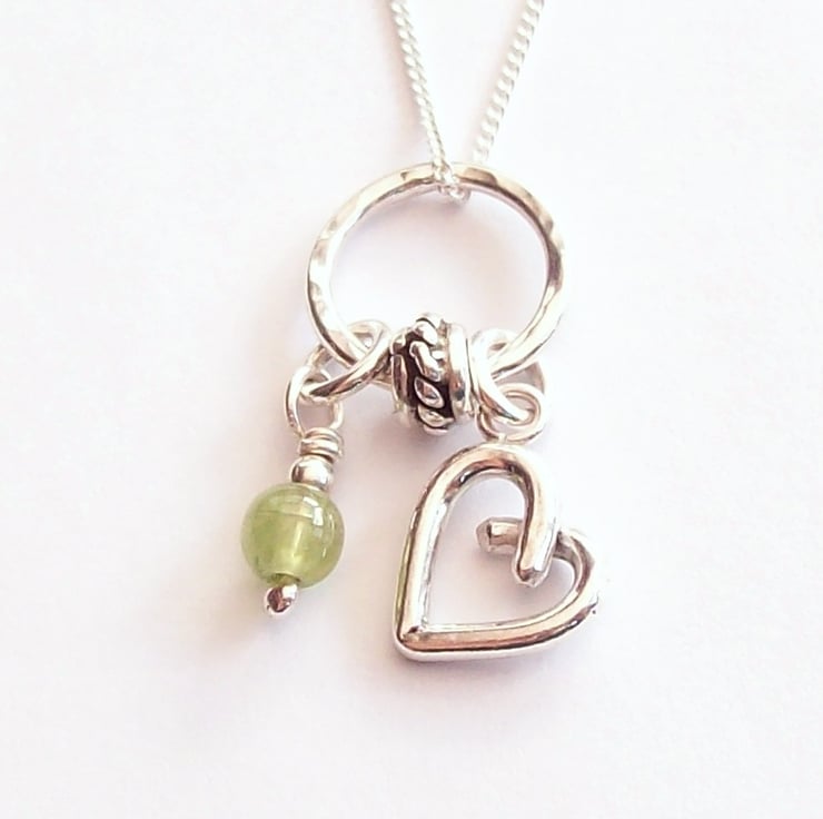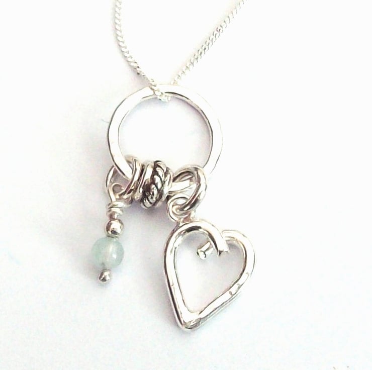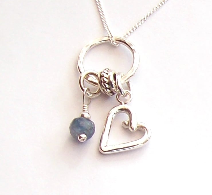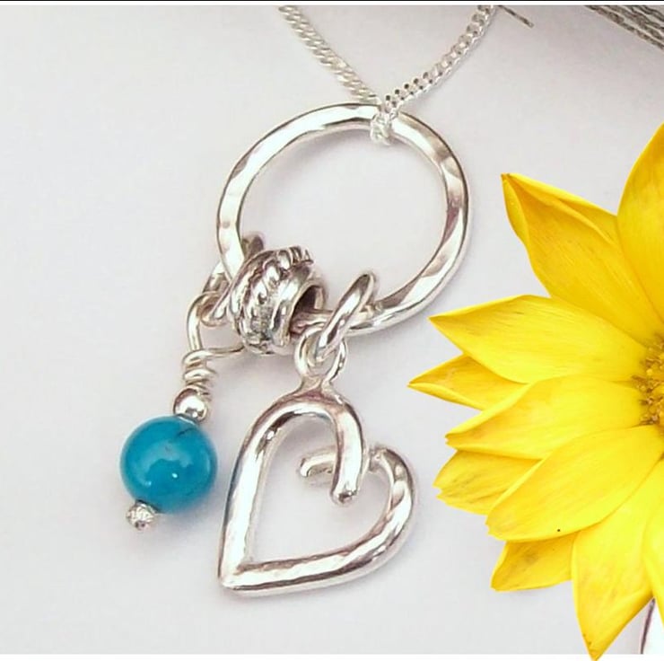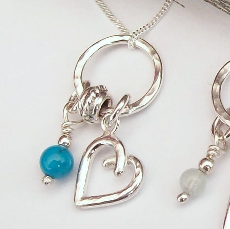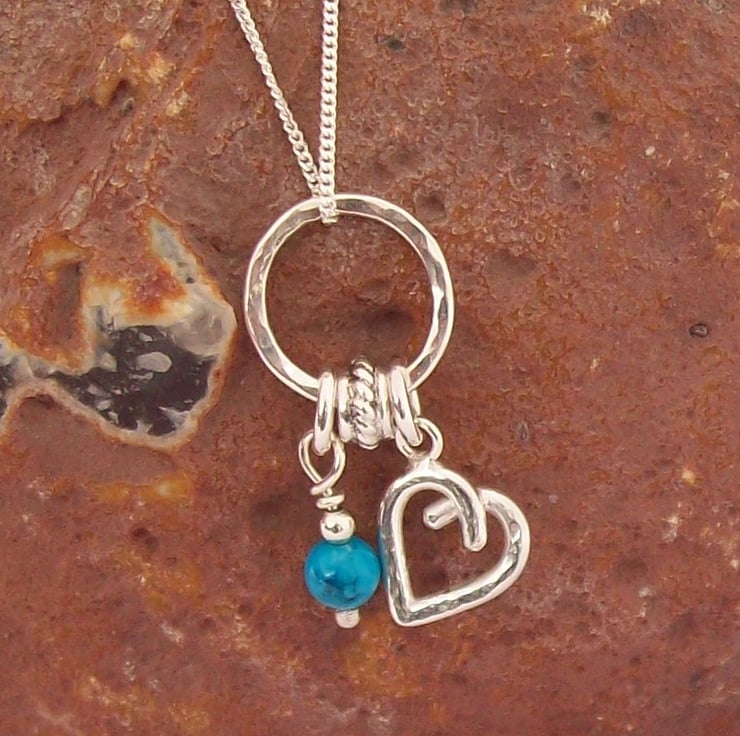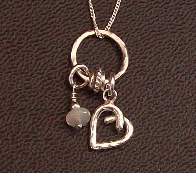The charm Necklace consists of a Sterling Silver handmade washer style ring, this holds a Sterling Silver Handmade Heart, both have been hammered to give extra decoration and catch the light.