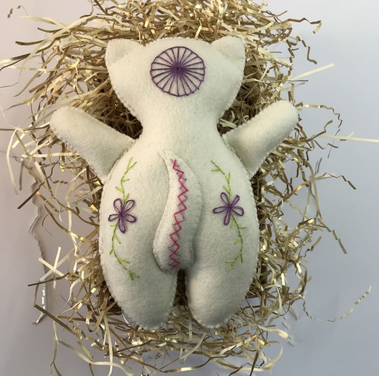 This is the lovely Lilly, who is entirely handmade from pure wool felt in an Ivory white shade. She has beautiful deep blue eyes and is hand embroidered both back and front. She measures approximately 19cm or 7.5 inches high.