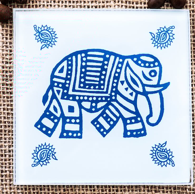 This lovely glass coaster shows an Indian elephant in a rich blue colour. At each corner is a blue paisley motif.