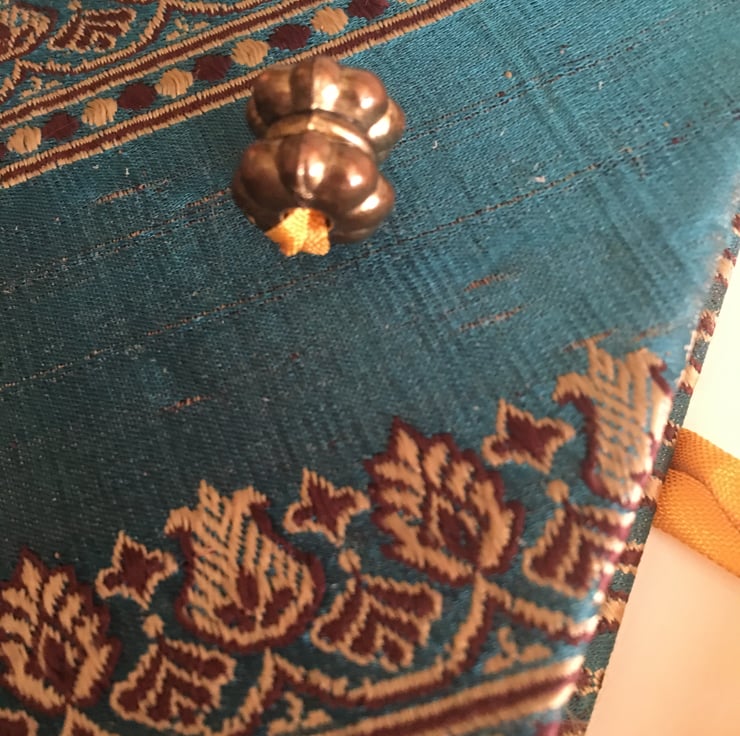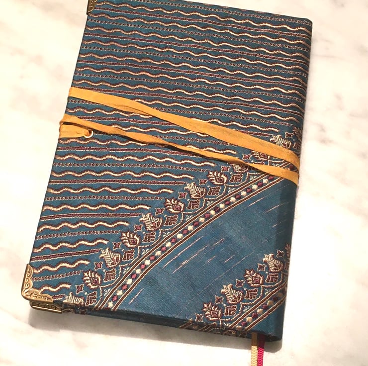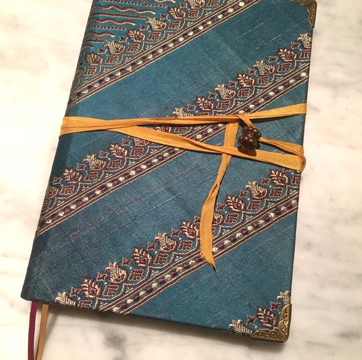 Teal and gold brocade fabric, an old Javanese bead and some vintage style gold ribbon give a luxurious and beautiful look to an A5 notebook containing over 250 pages of lined paper with the edges tinted pale gold and finished with twin dark red and gold ribbon bookmarks, a Javanese bead and decorative metal corner protectors. The fabric was from a skirt, the bead was from a broken necklace bought in Indonesia, the vintage style ribbon is new. If you like keeping a journal then this gorgeous and unique one could be yours.