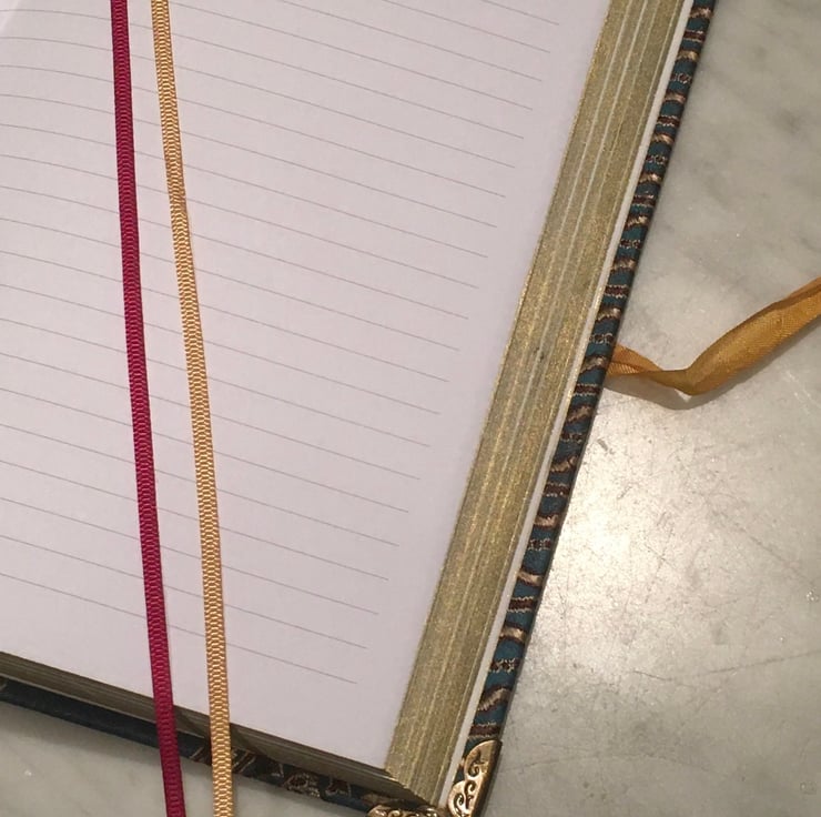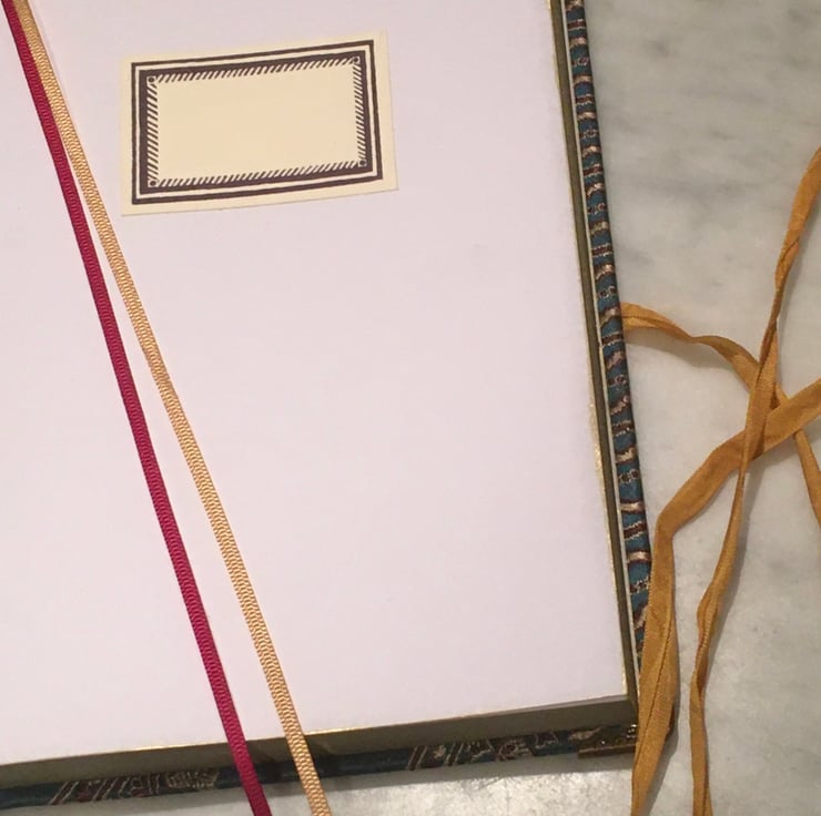 Handbound A5 fabric covered journal with bead and ribbon closure, 256 pages lined white paper edged in pale gold, name label on inside front cover, two grosgrain ribbon page markers in dark red and gold, navy and silver endbands, measures max 220 x 155 x 23 cm.