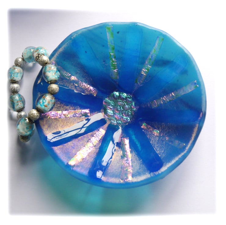I've then decorated the top with strips of a deeper blue turquoise and then lots of my gorgeous and precious dichroic glass with lovely shimmers.