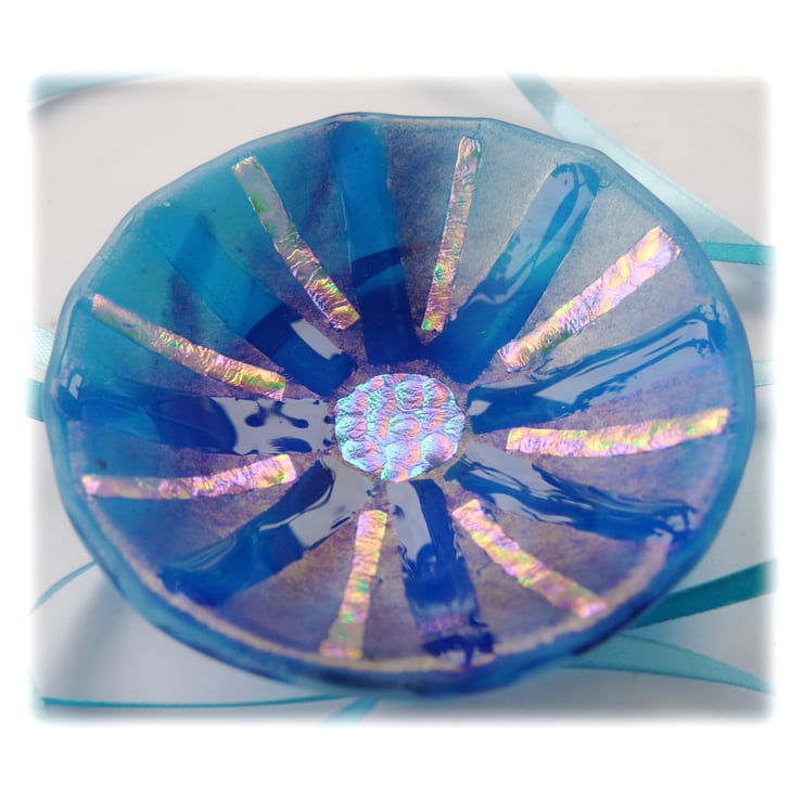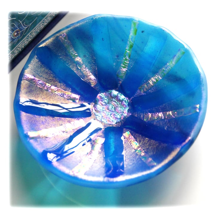 This round dish has a base of streaky turquoise which is topped with a layer of iridescent turquoise.