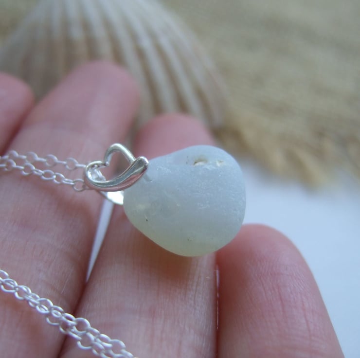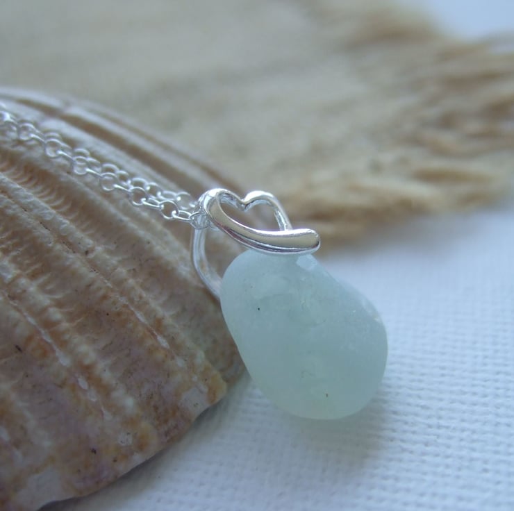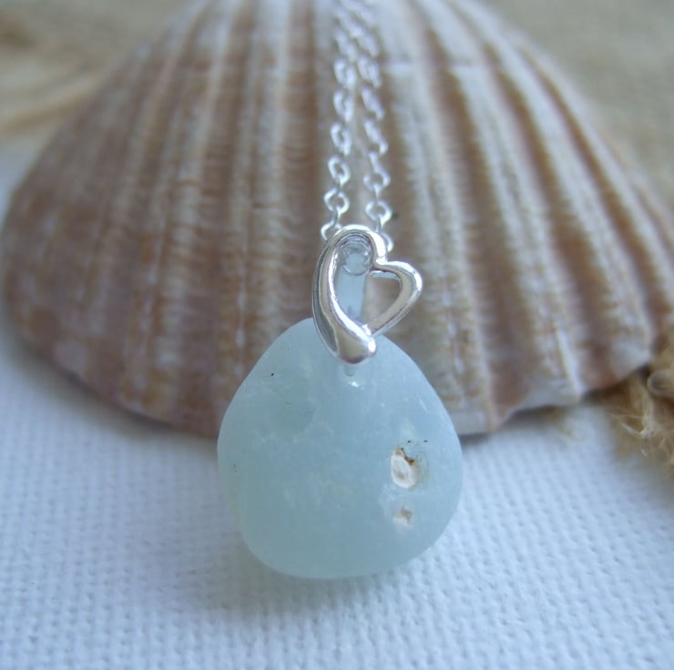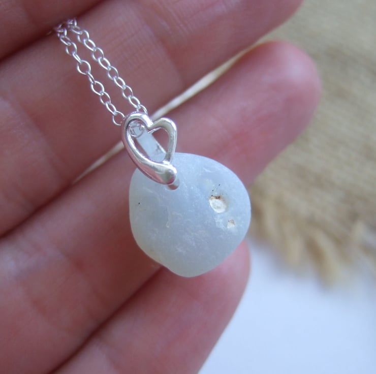 Heart shaped sterling silver setting paired with opalescent sea glass from Seaham. Opalescent sea glass has s subtle blue shimmer with a yellow hint - the colour of the sea glass changes with the light! It is best visible when wet or ever so slightly oiled with unscented baby oil. The sea glass is sheer and will let light through, which makes the pendant glow.