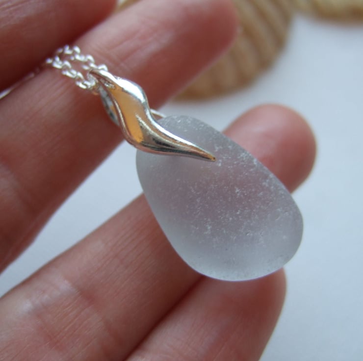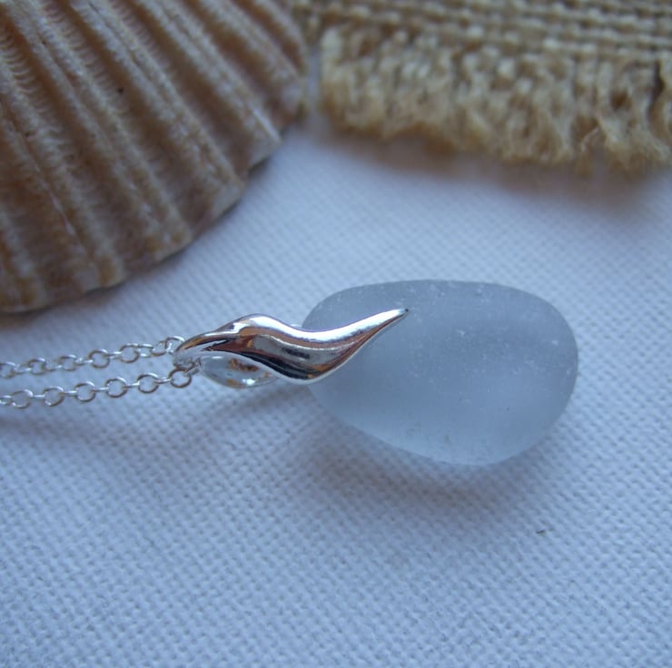 Sophisticated rare light grey sea glass pendant with a sterling silver bail in wave shape on 18" sterling silver chain ( any other length is silver plated!) . This would make a fantastic gift for a loved one... on a special occasion, like Valentine's Day or a Birthday.