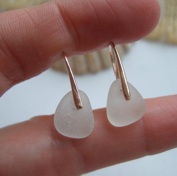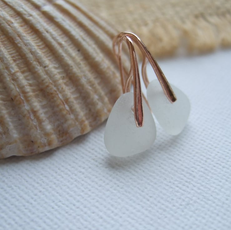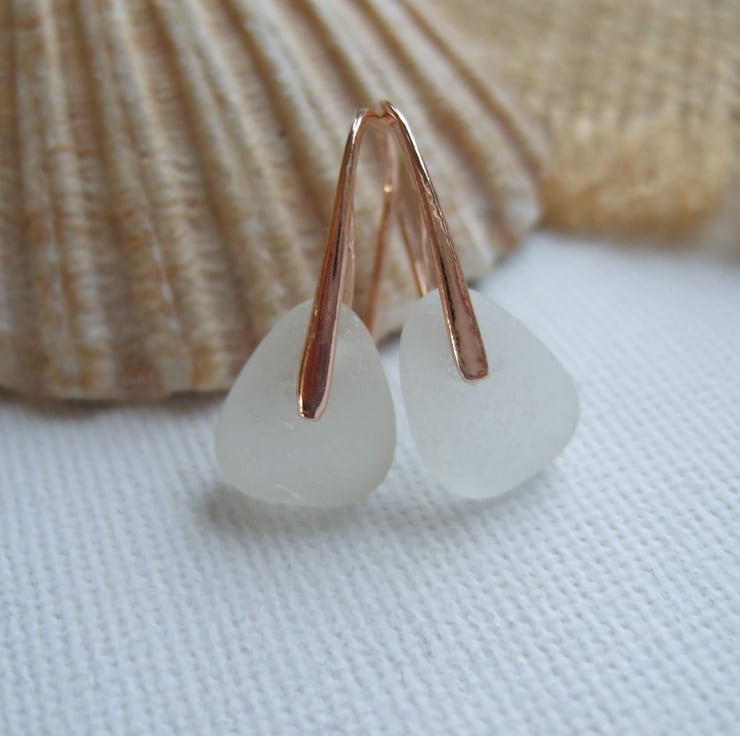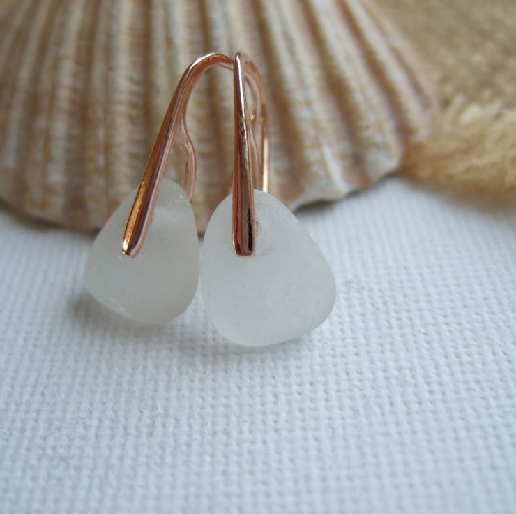 WATERDROPS... Elegant 18K rose gold plated on sterling silver earrings with top drilled white Scottish sea glass in water drop shape.