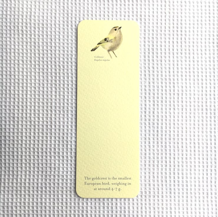 The bird's name is given in English and Latin, and at the bottom of the bookmark, a little bit of information about the Goldcrest is provided.