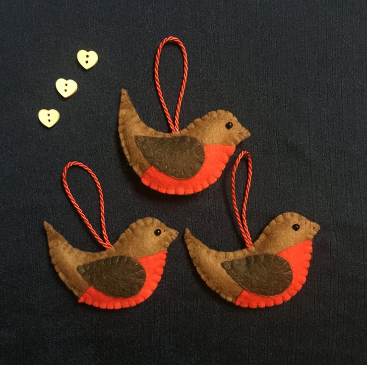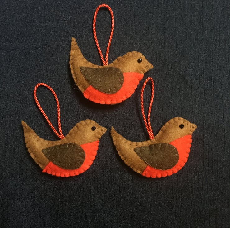 The robin is hand cut from felt, with a beaded eye, and ribbon for hanging. It has been finished with blanket stitch. The back is plain.