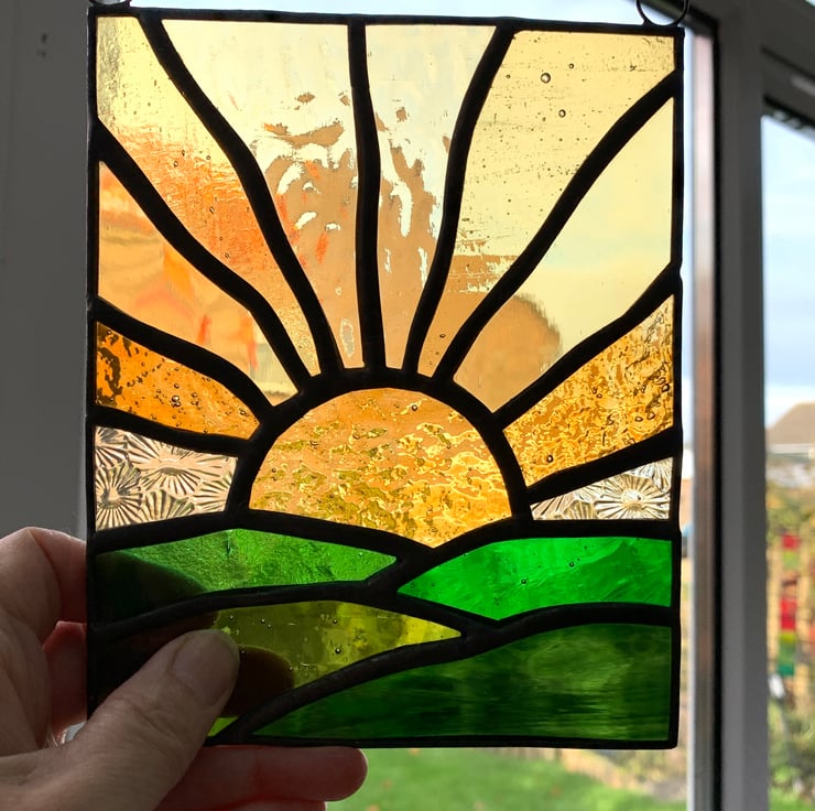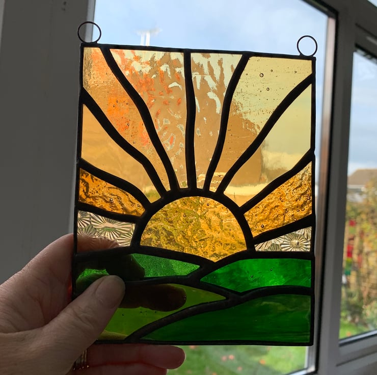 Different types of green stained glass have been used for the hills and six types of amber glass for the sun and sun rays.
