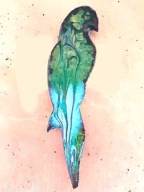 To make it I first built up a base of clear enamel over the copper shape. I then added a layer of green enamel. Over that I scattered small heaps of white enamel and when the parrot was red hot in the kiln I drew through the enamel with a steel point to add the plumage to the bird.