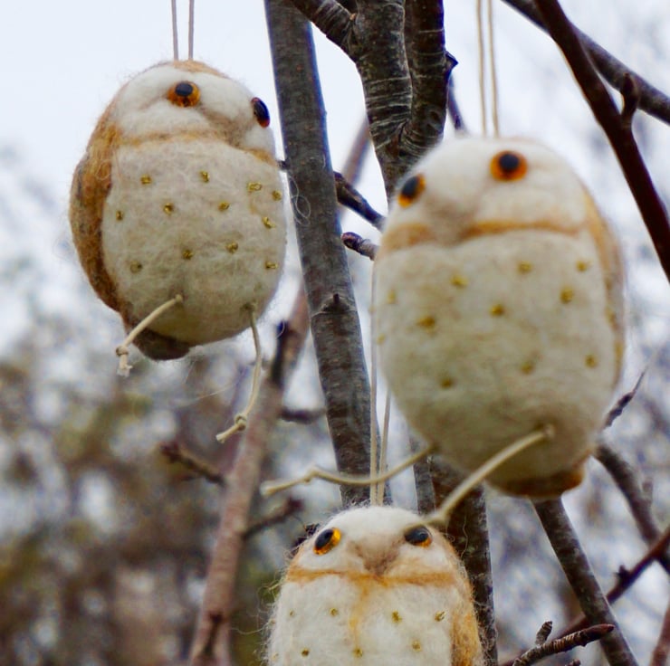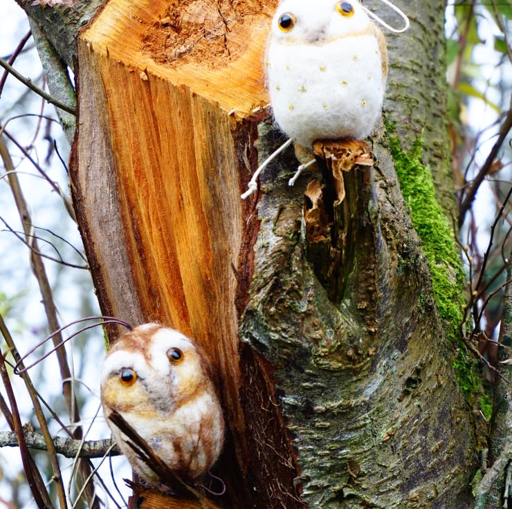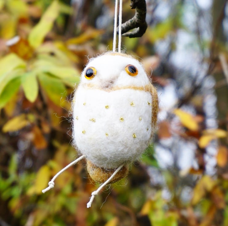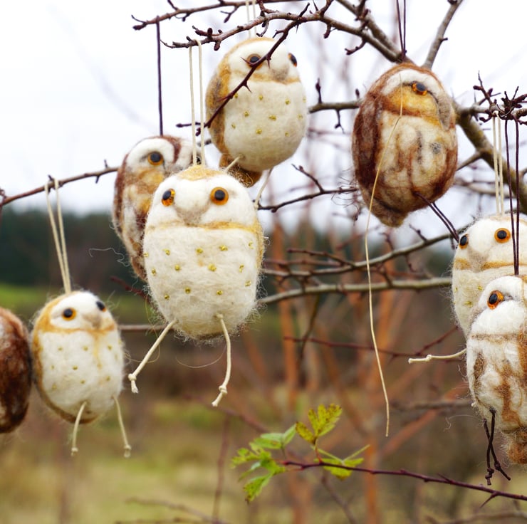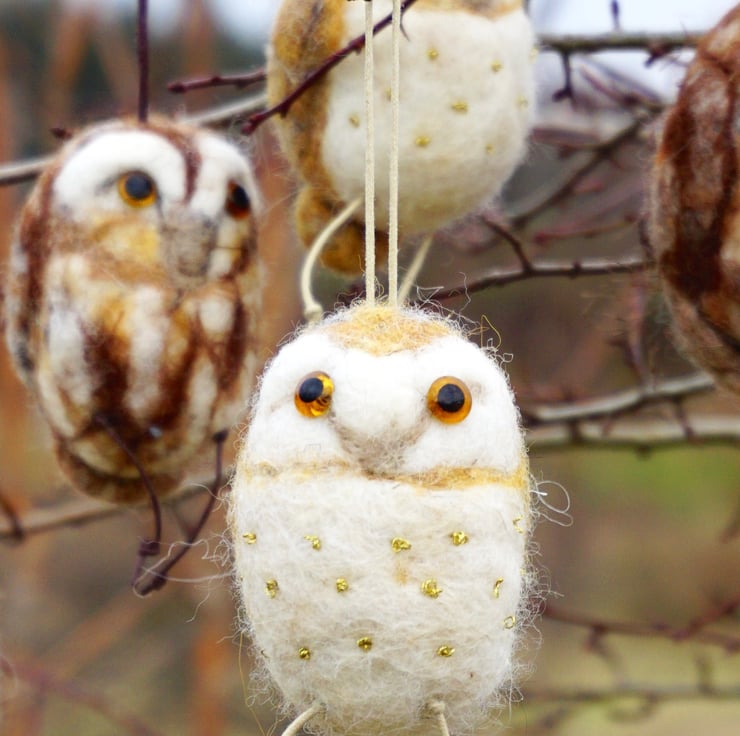 Unique hand barn owls made using the wet felting technique, and hand stitched gold thread details,these little birds look good all year round in your home,not just for Christmas, measure approx 3" tall.they have a hanging loop.