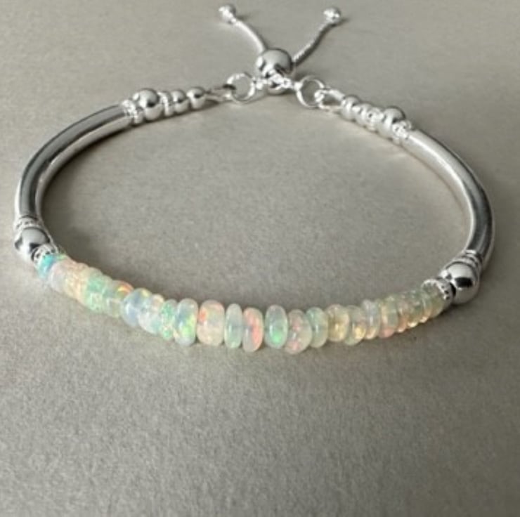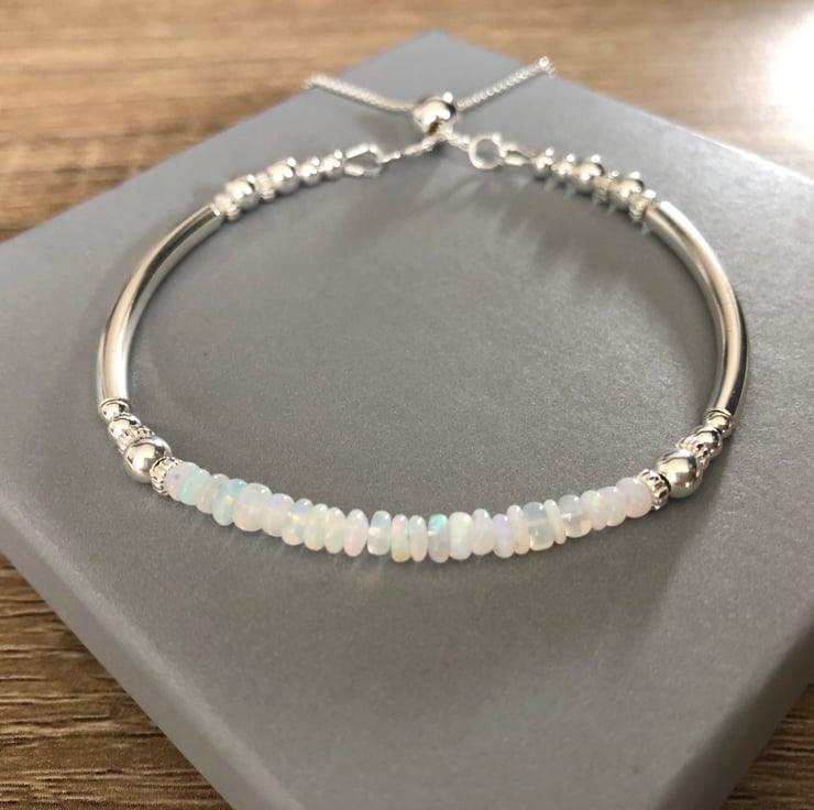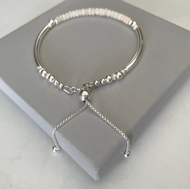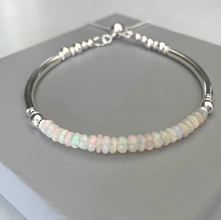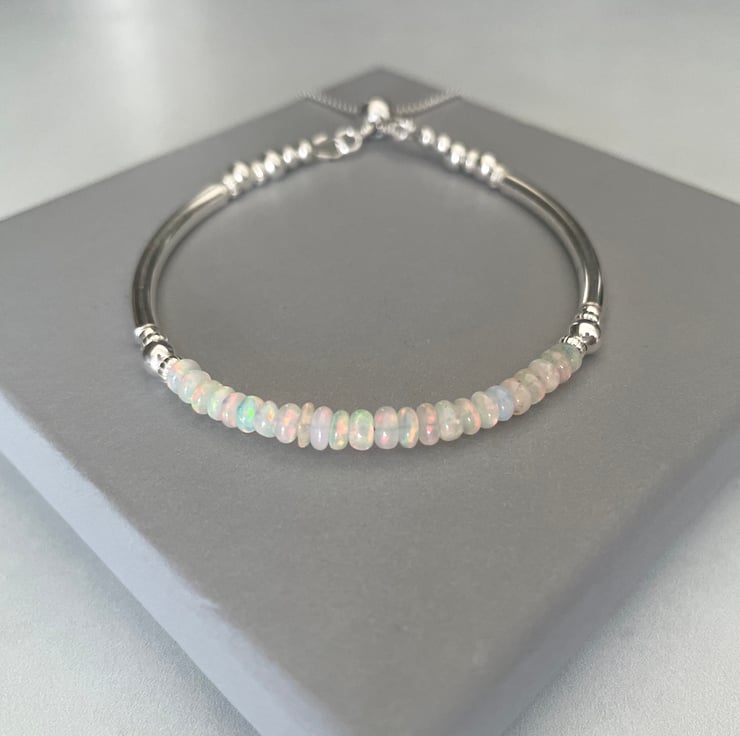 This delicate bracelet is handcrafted with glowing 3 - 4mm Ethiopian opal gemstones and finished with sleek sterling silver noodle beads. The natural opals display flashes of rainbow colour that shimmer beautifully as the light catches them.