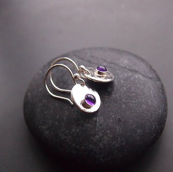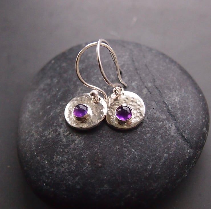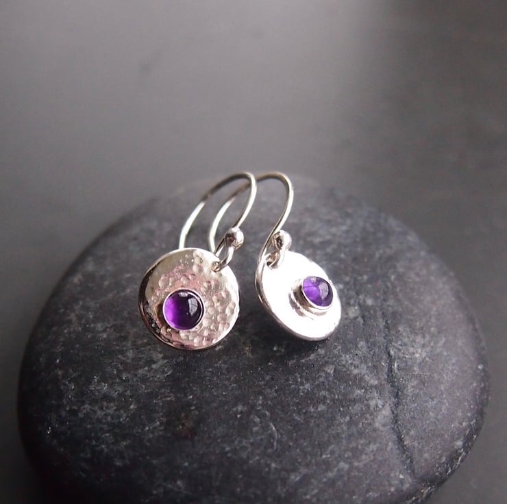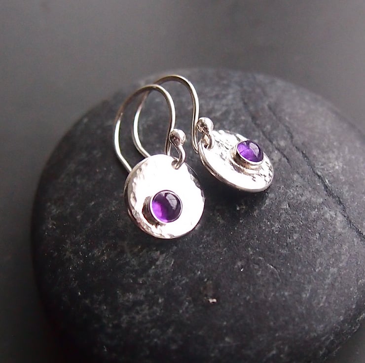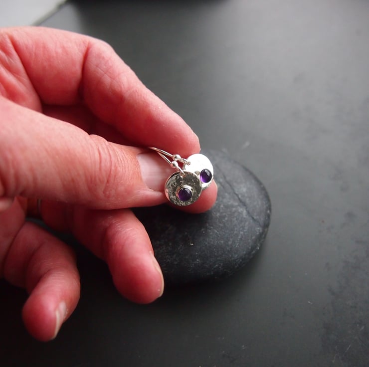 These earrings have a sterling silver disc which I have textured for interest and reflection. They have a bezel set 4mm amethyst for a pop of colour .We have lots of alternative stones so please ask if you would like something different . The discs measure approximately 10mm and hang from hand made earring wires.