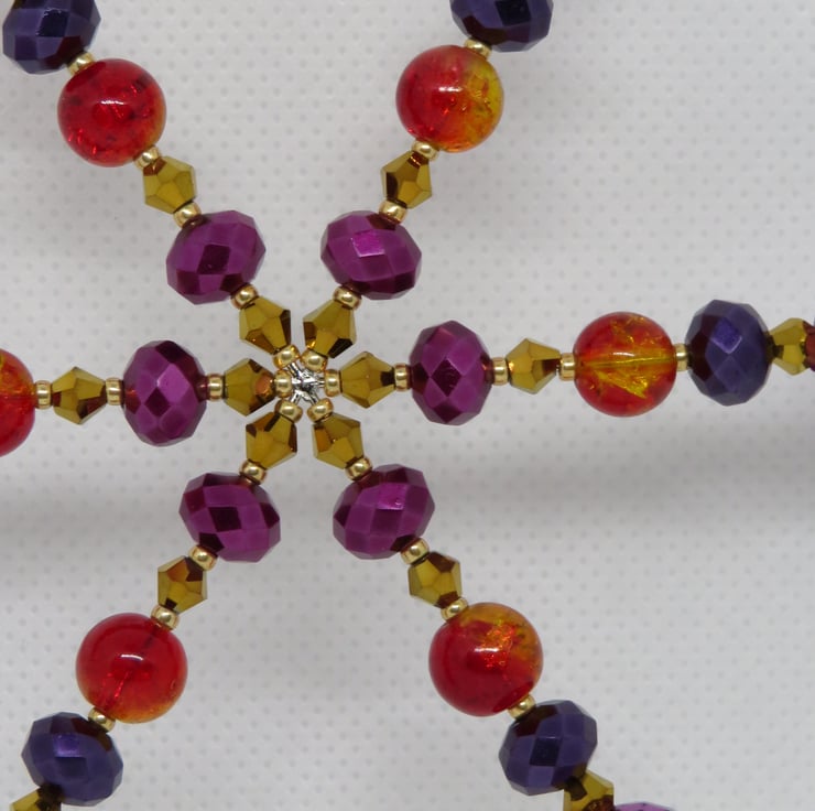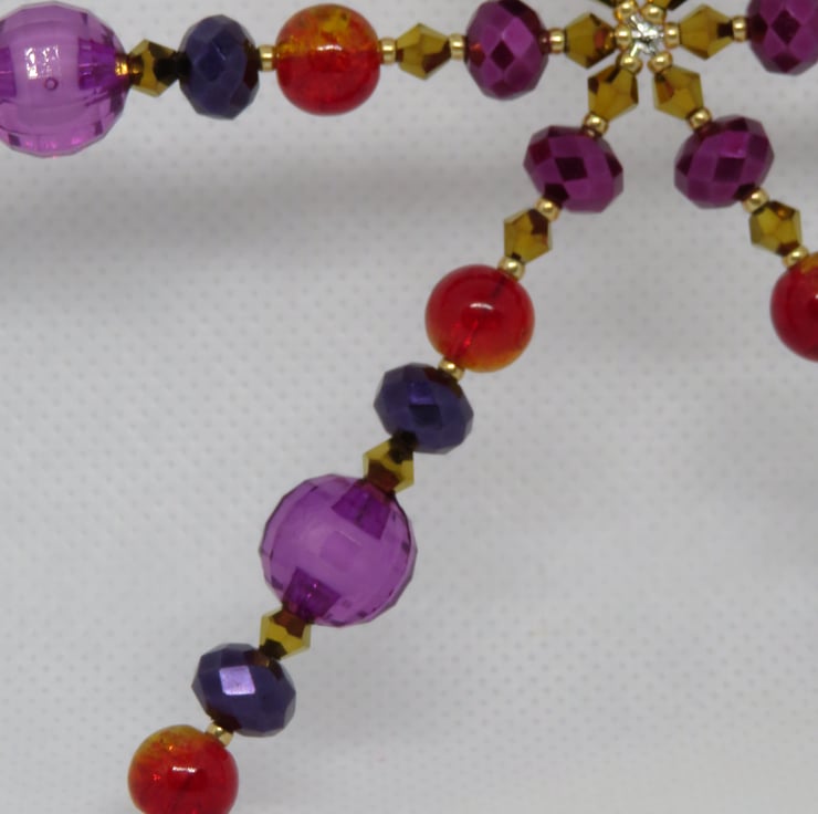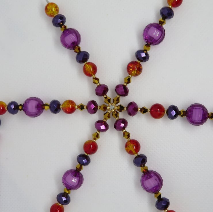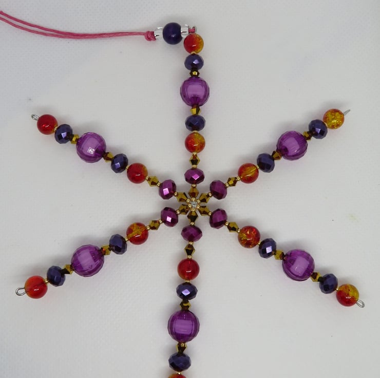 This snowflake is hand beaded onto a wire frame and contains a gorgeous mix of glass beads, facetted glass pearls, bicones, seed beads and purple plastic beads, all in jewel tones. Not just for Christmas, as you could use this as a suncatcher the rest of the year. It hangs from a length of pink waxed cord, which is also decorated with a wooden bead and clear glass beads.