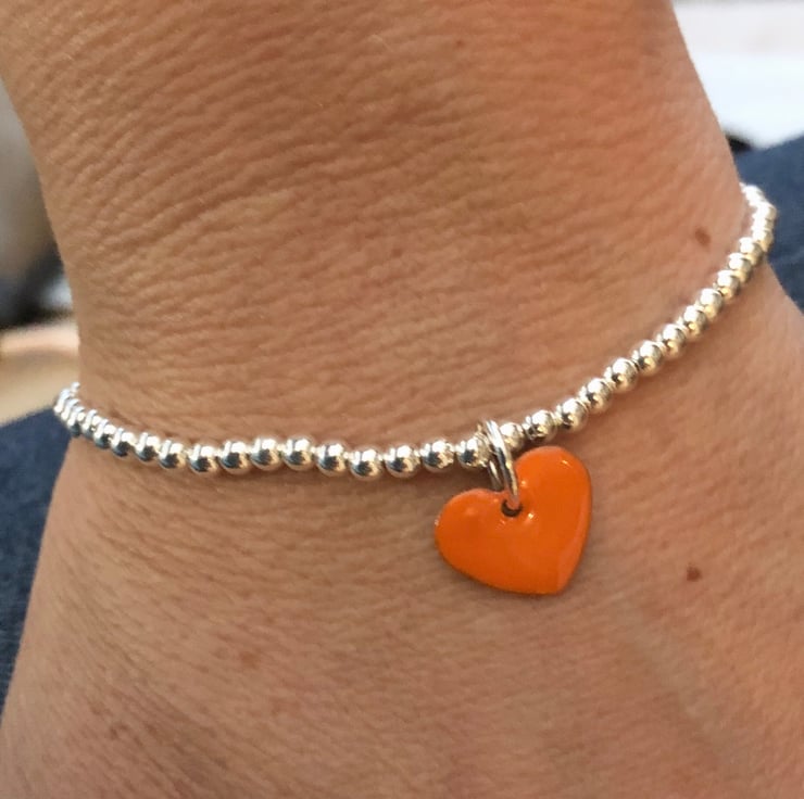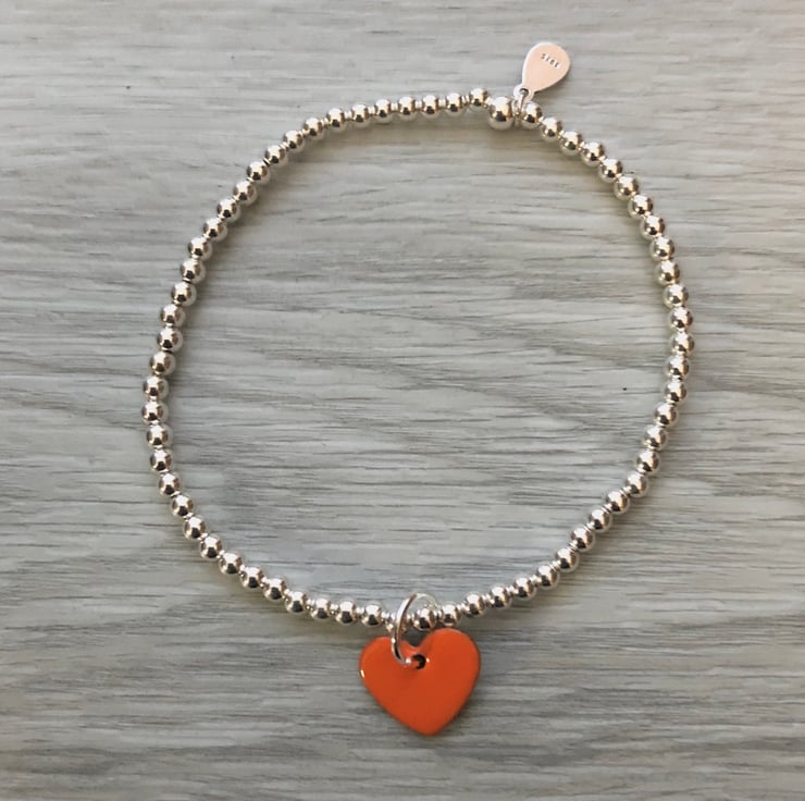 This cute 13mm stainless steel heart charm has been hand enamelled using the cold enamel technique and attached to a hand beaded bracelet.