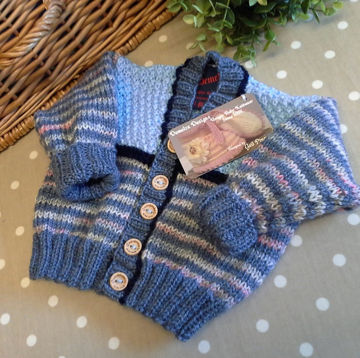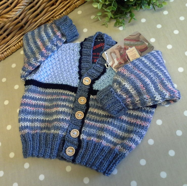 A sweet practical baby boys cardigan lovingly designed and hand crafted using quality branded British and French premium machine washable yarns. The buttons are made from genuine wood with a touching sentiment burnt etched on them.